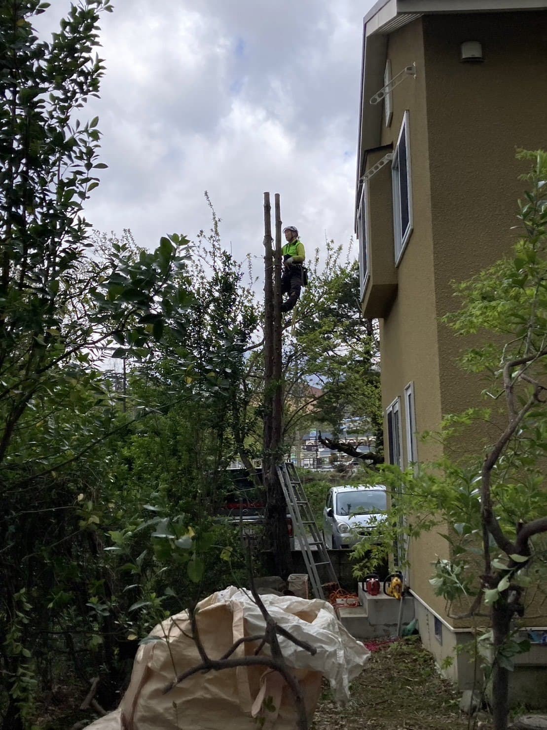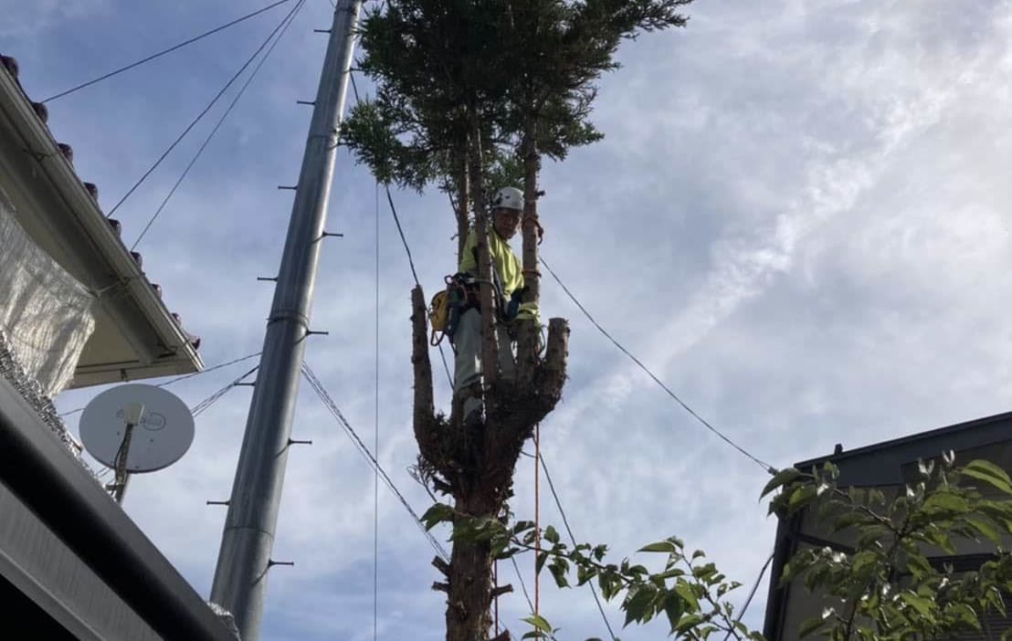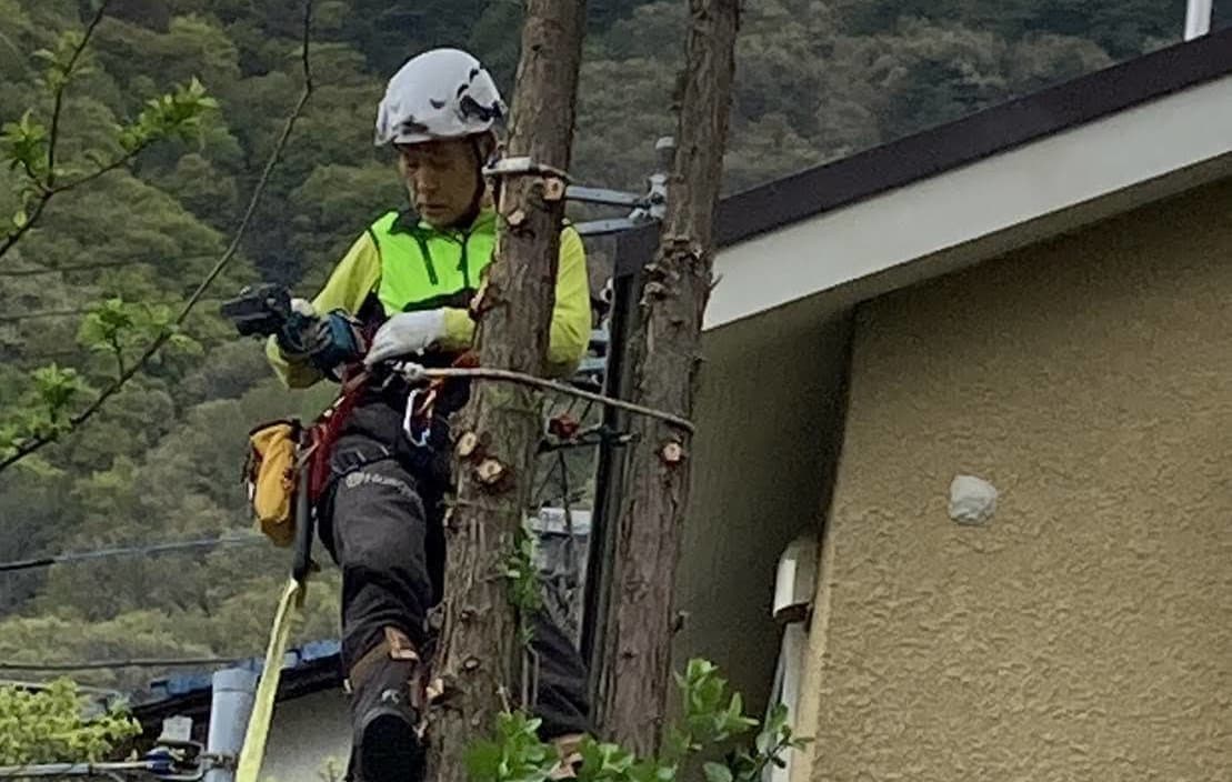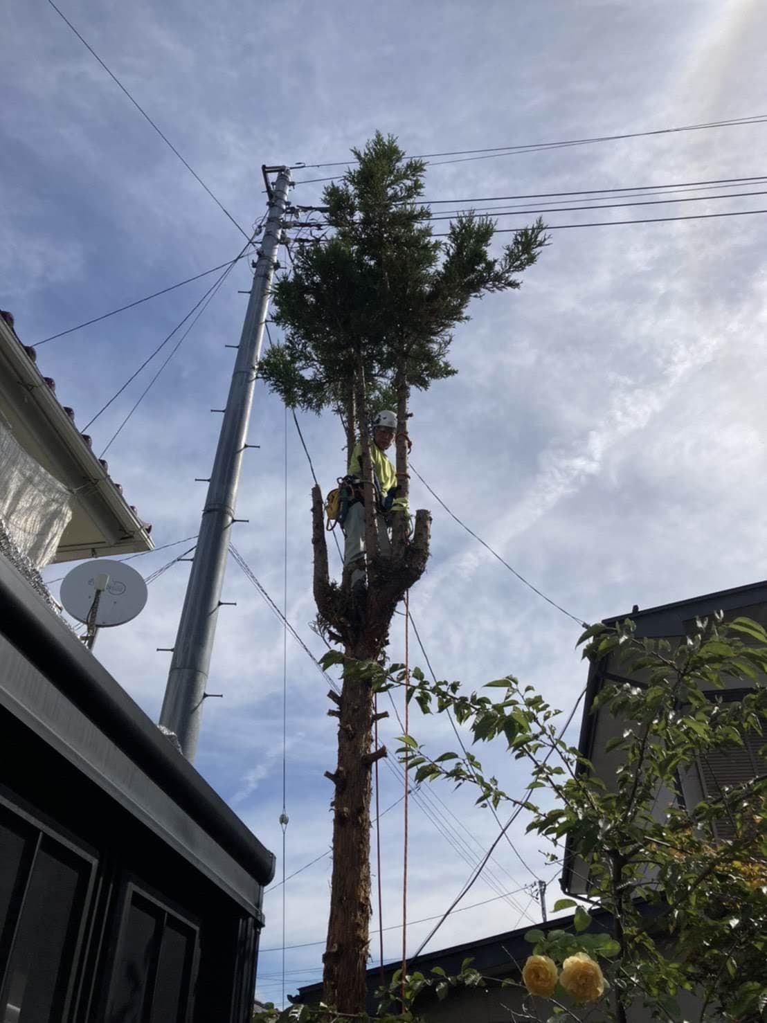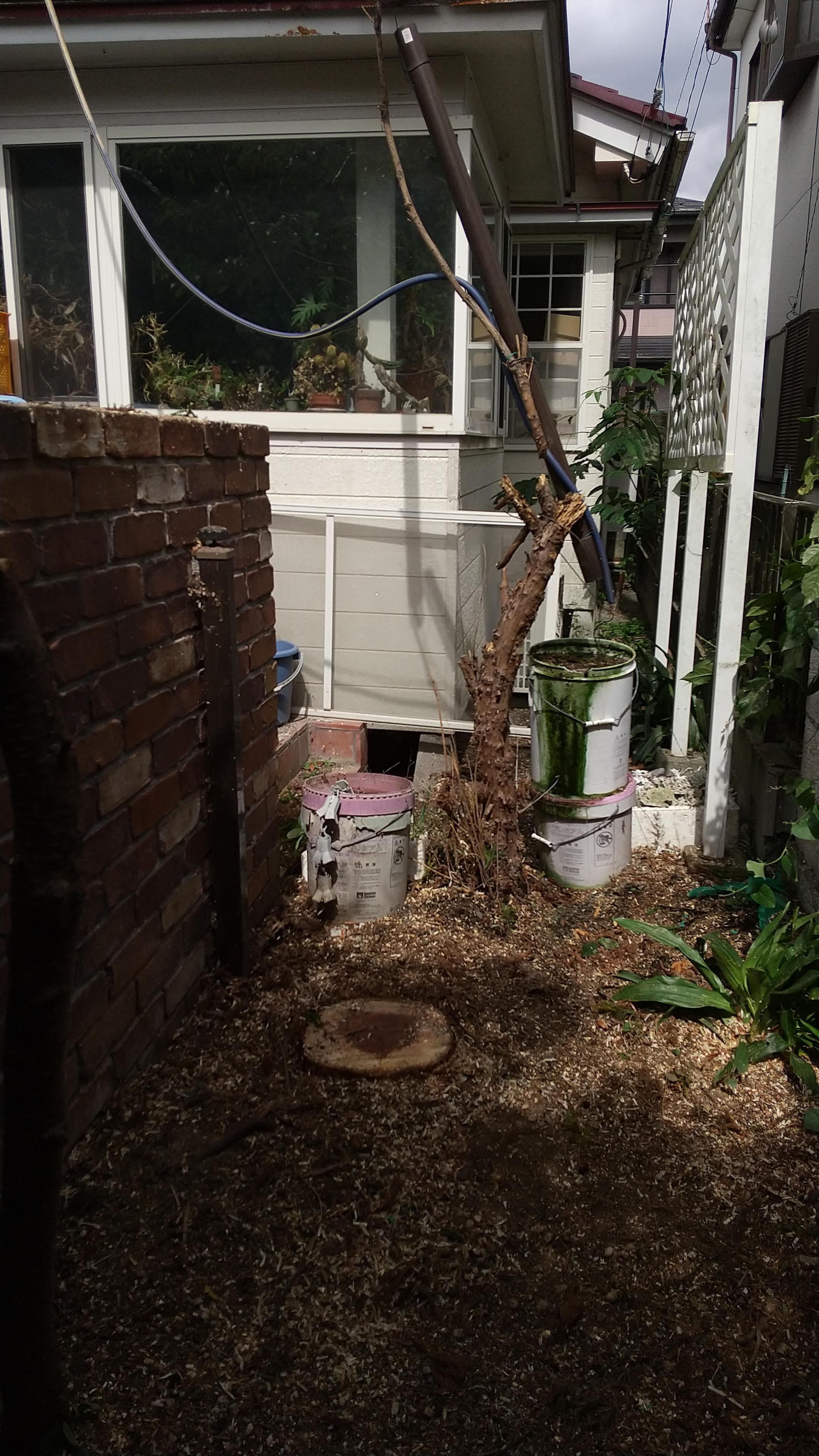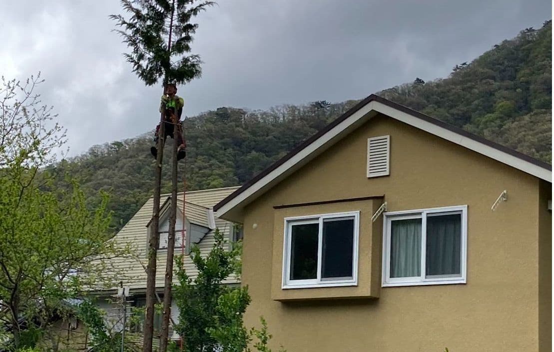 建物のすぐ脇に生えている木の伐採。高さはないので楽だった。なかなかオシャレな庭だった。木は杉と柏。