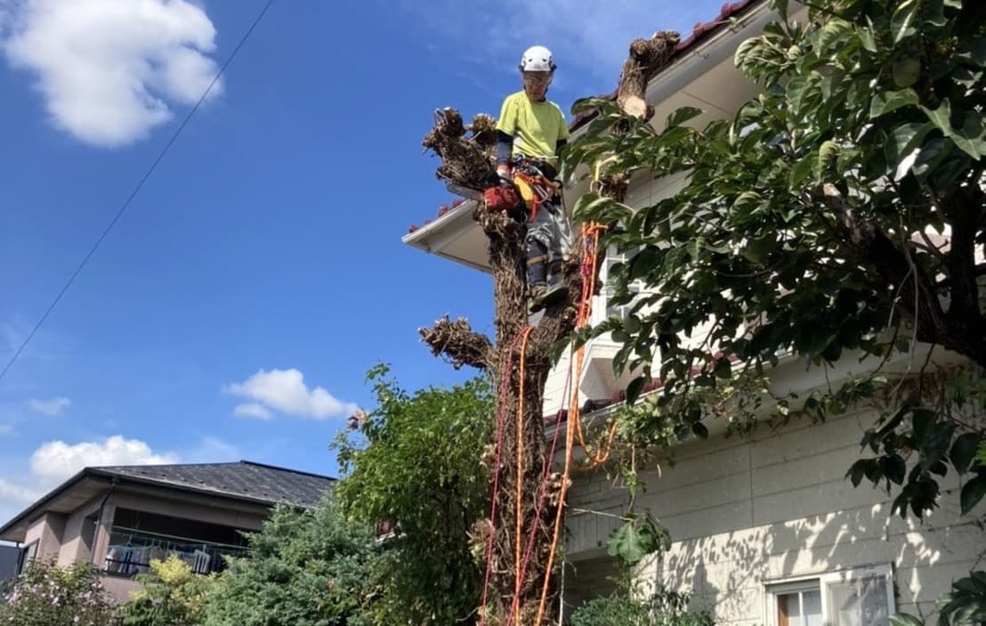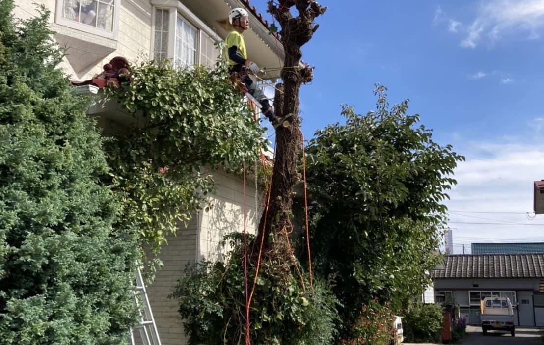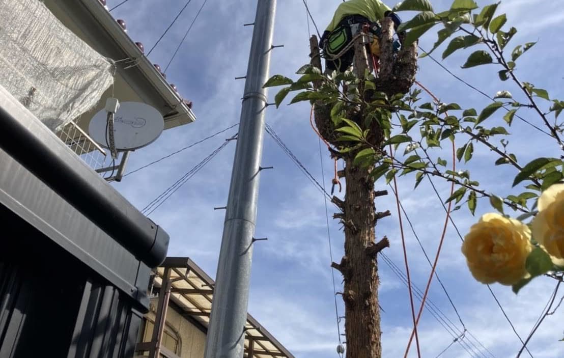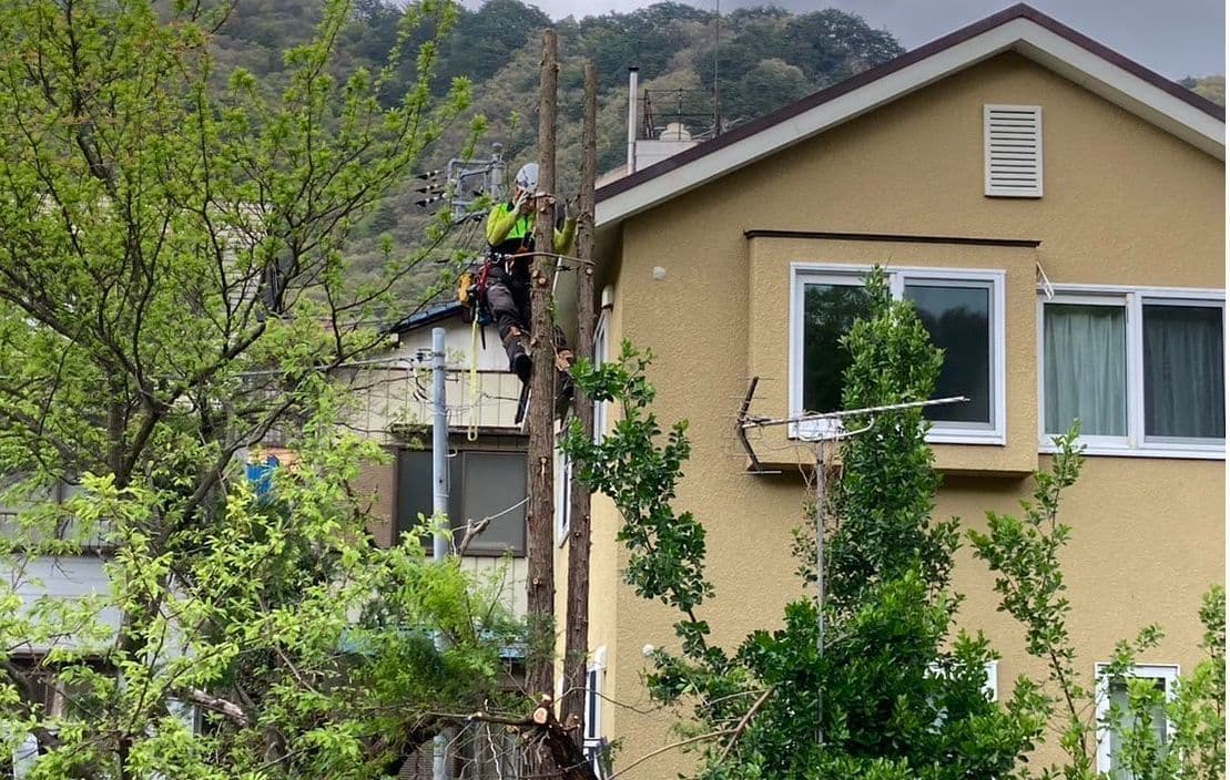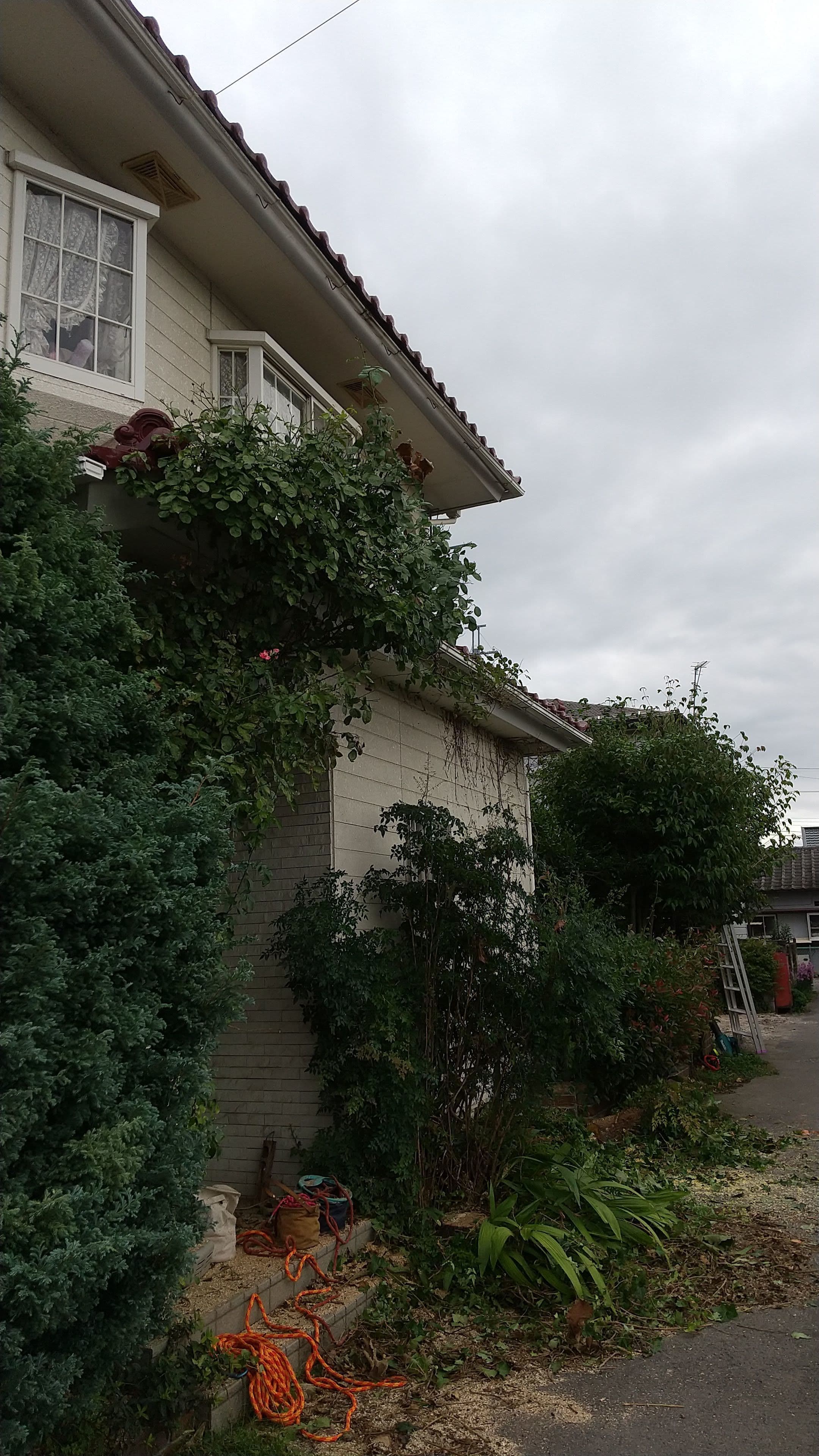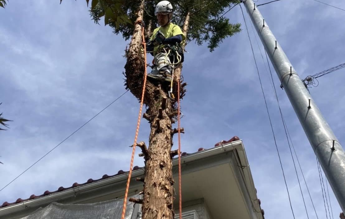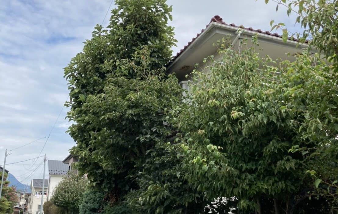 建物のすぐ脇に生えている木の伐採。高さはないので楽だった。なかなかオシャレな庭だった。木は杉と柏。