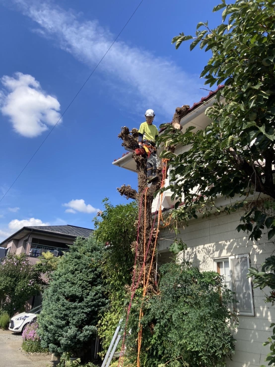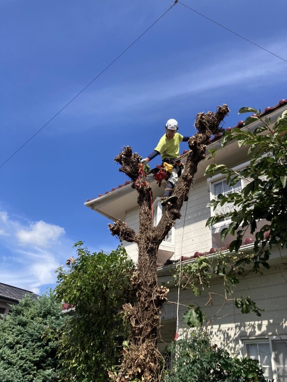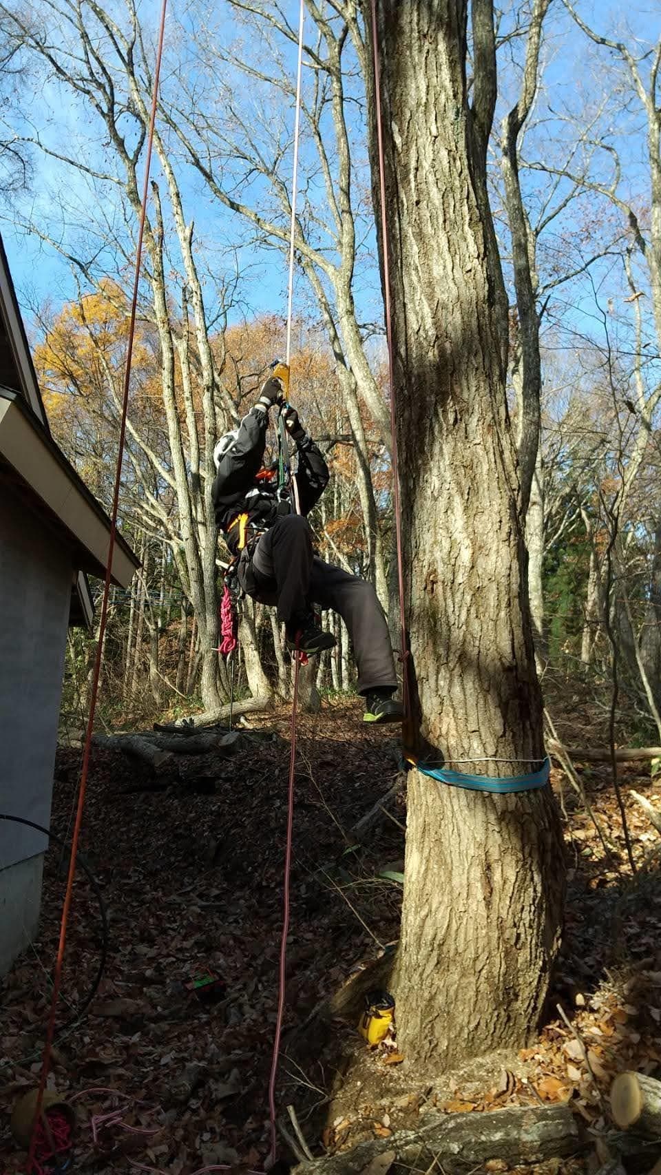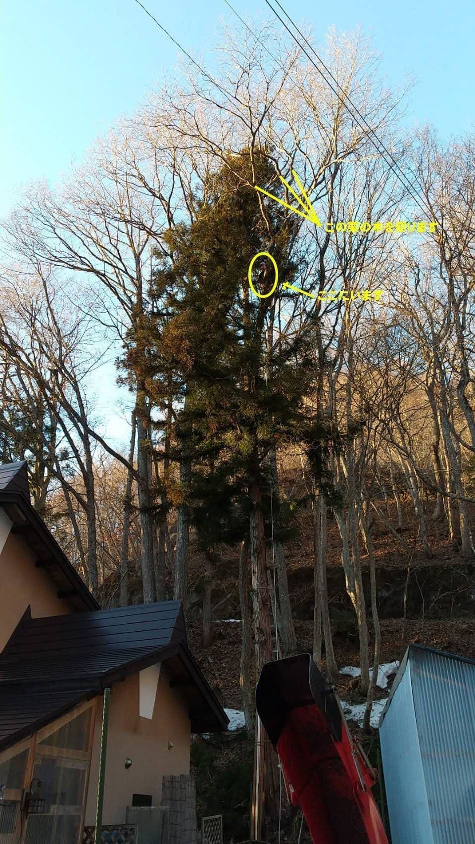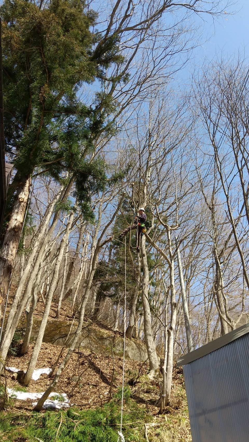 手伝いで、別荘の屋根に被さっていた枝の伐採。高さ15mほど。経験不足でまだ枝先の方までは行けなかった。回収できなかったロープとスローラインを後日回収しに行った時の写真。