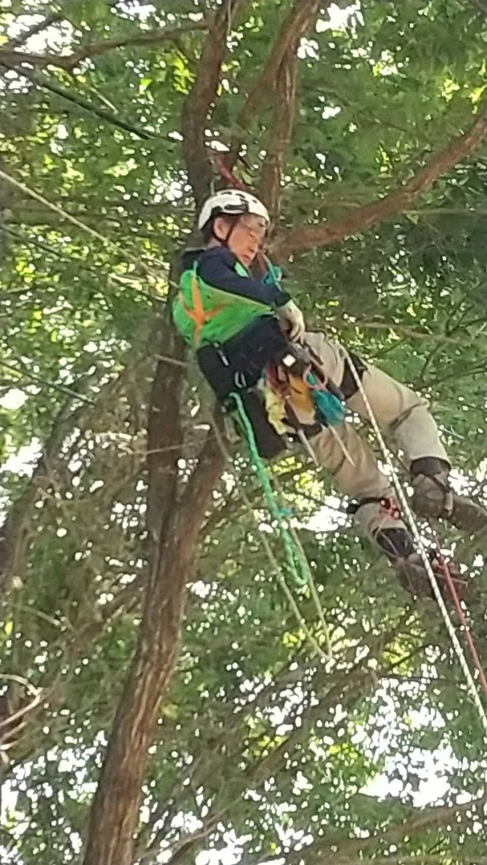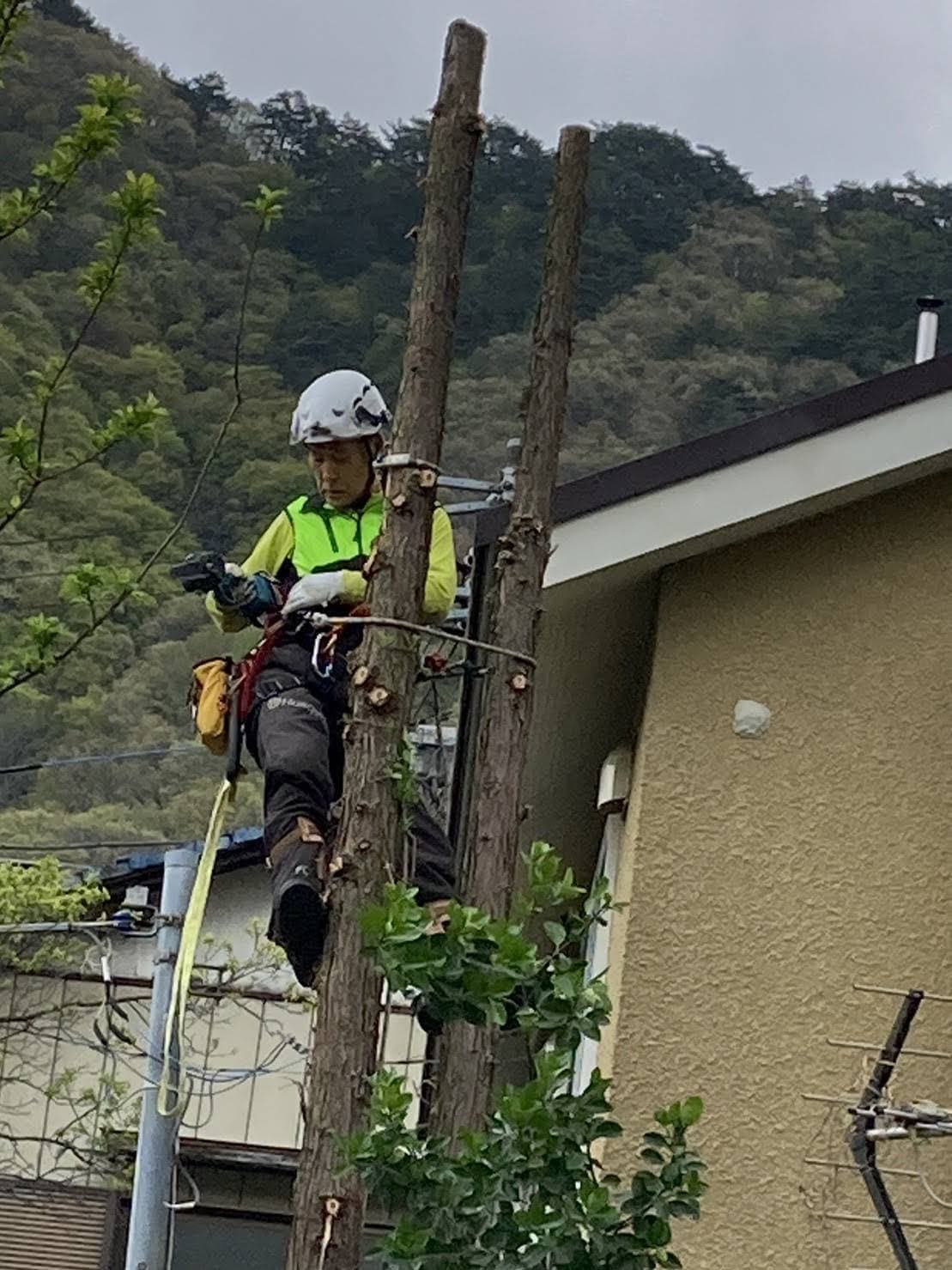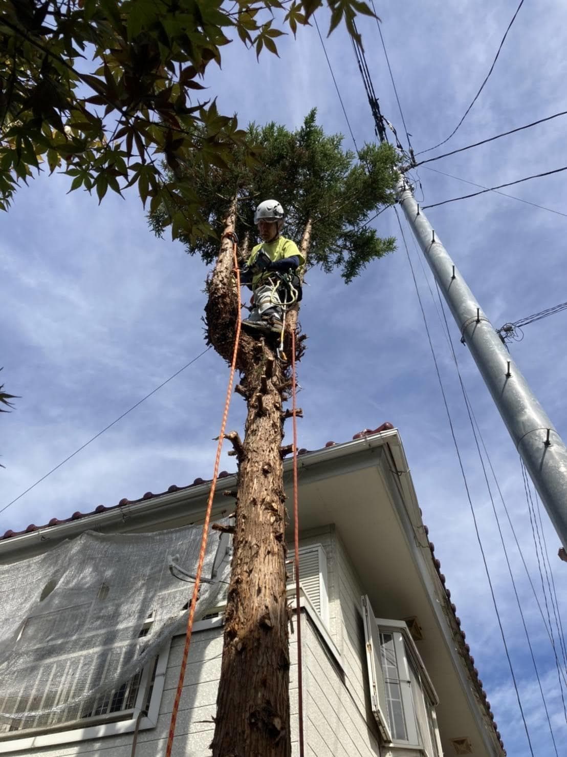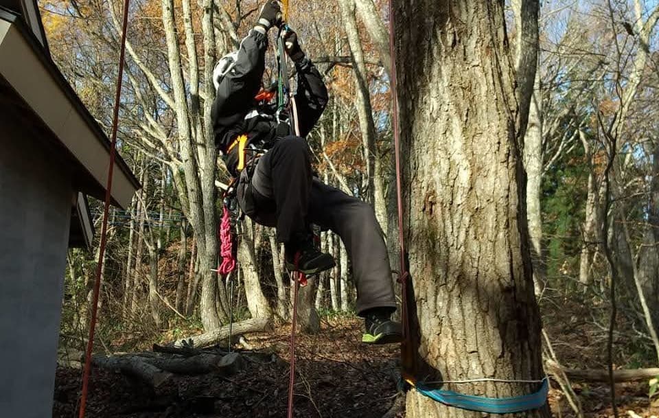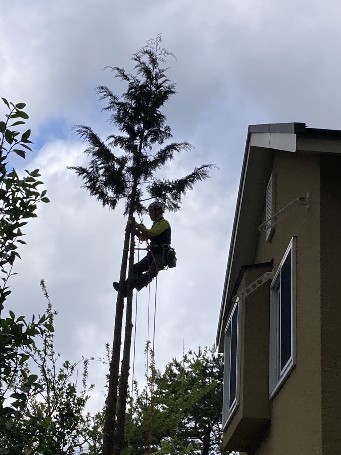 手伝いで、別荘の屋根に被さっていた枝の伐採。高さ15mほど。経験不足でまだ枝先の方までは行けなかった。回収できなかったロープとスローラインを後日回収しに行った時の写真。