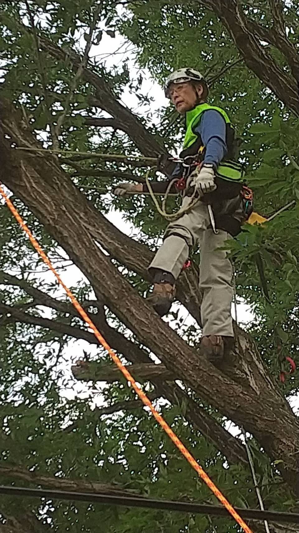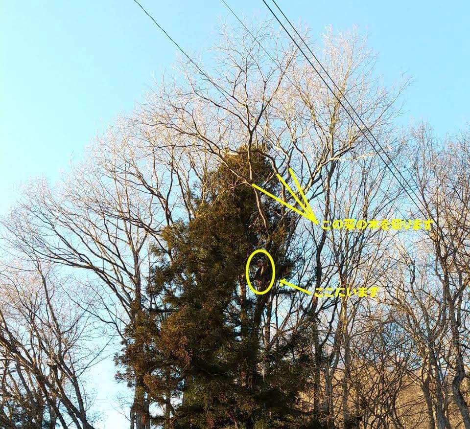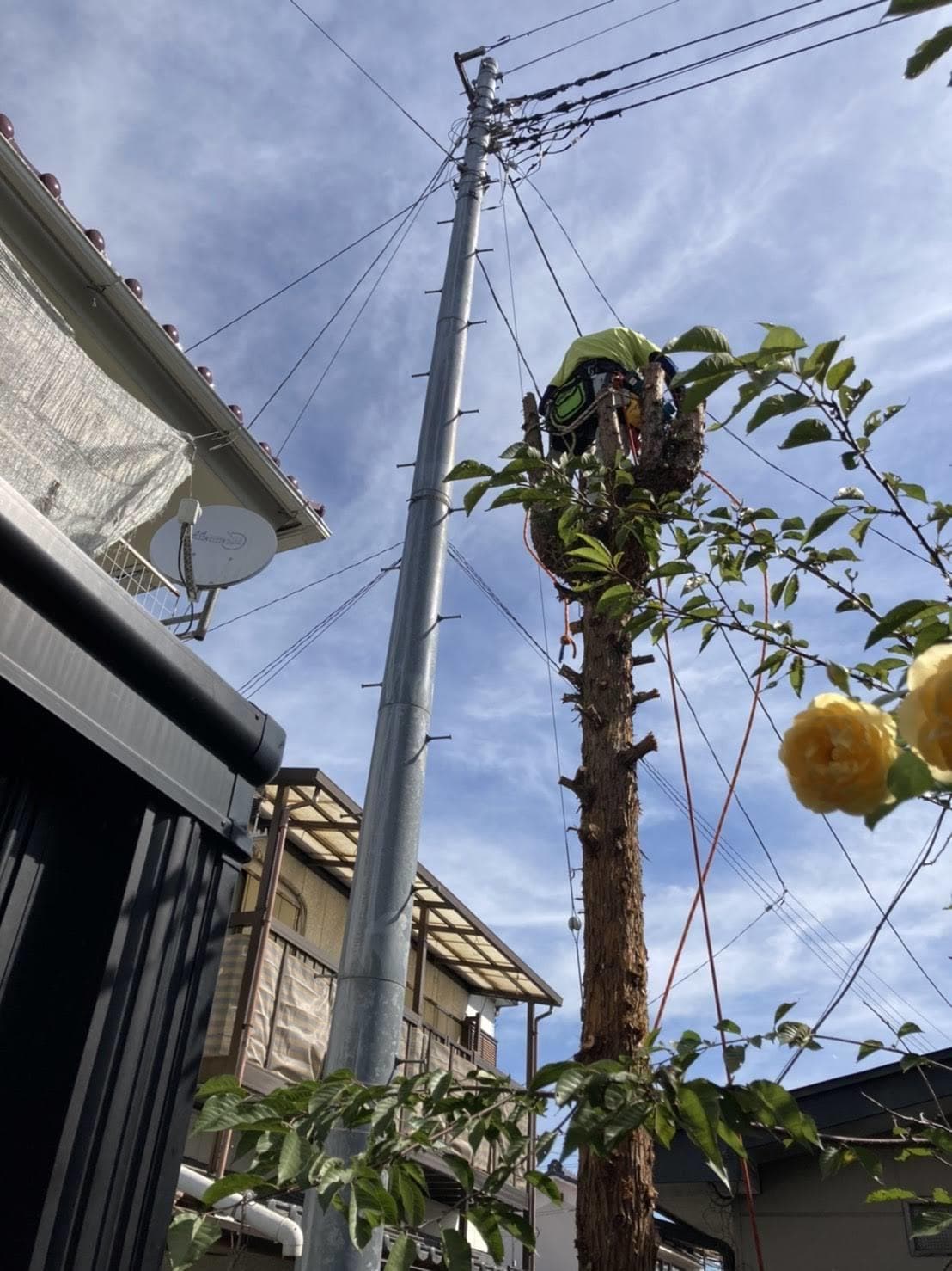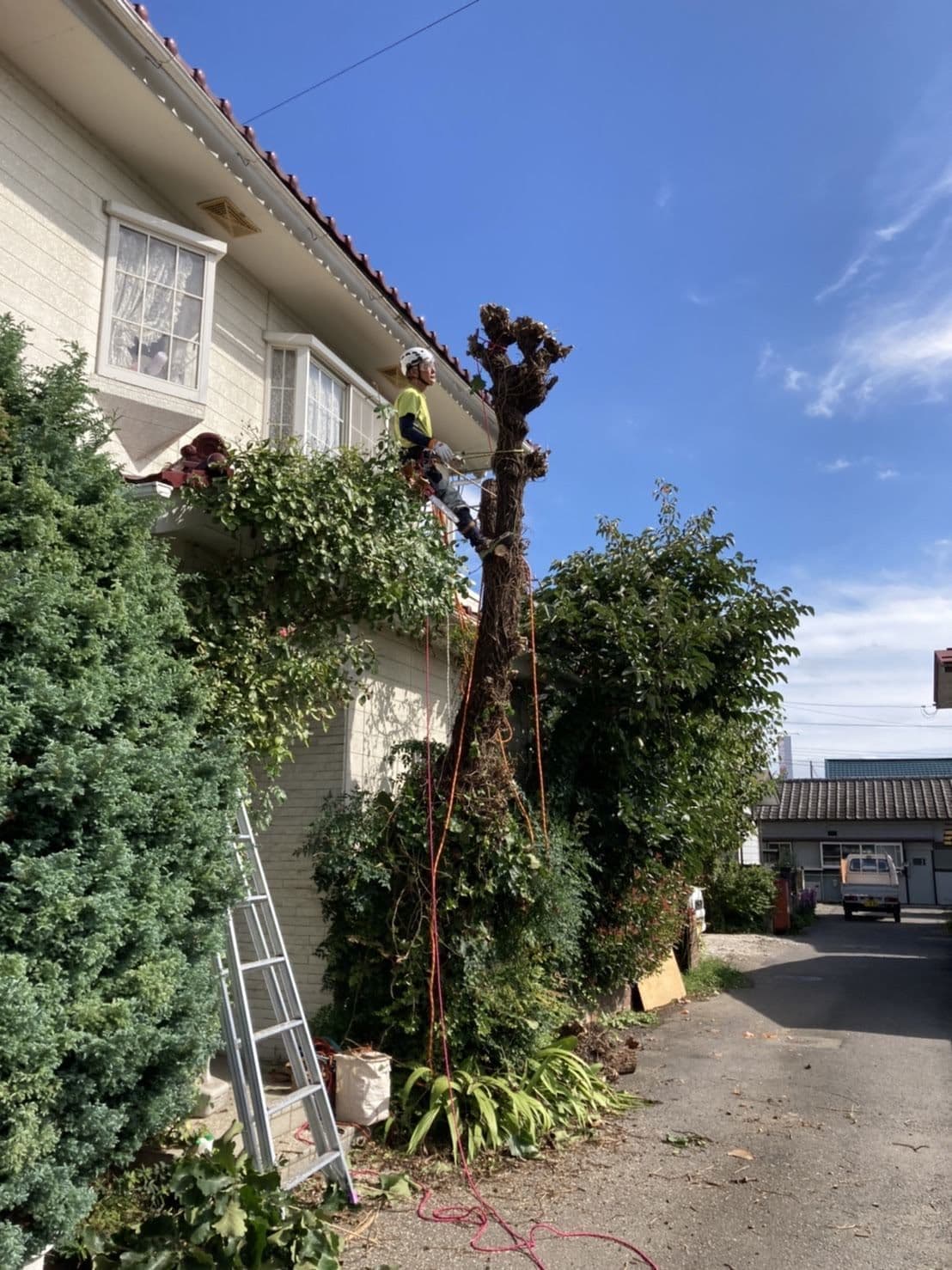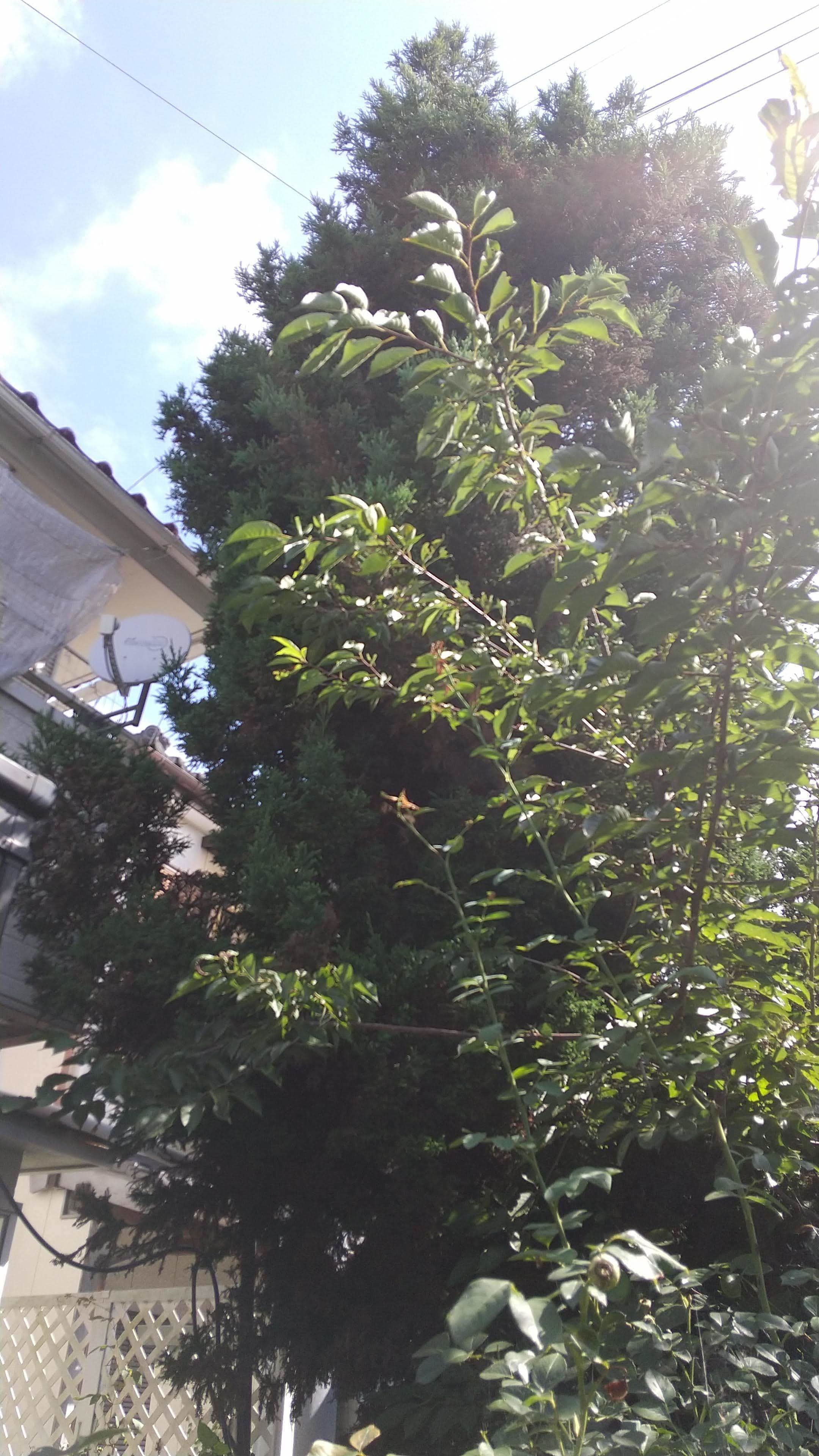手伝いで、別荘の屋根に被さっていた枝の伐採。高さ15mほど。経験不足でまだ枝先の方までは行けなかった。回収できなかったロープとスローラインを後日回収しに行った時の写真。