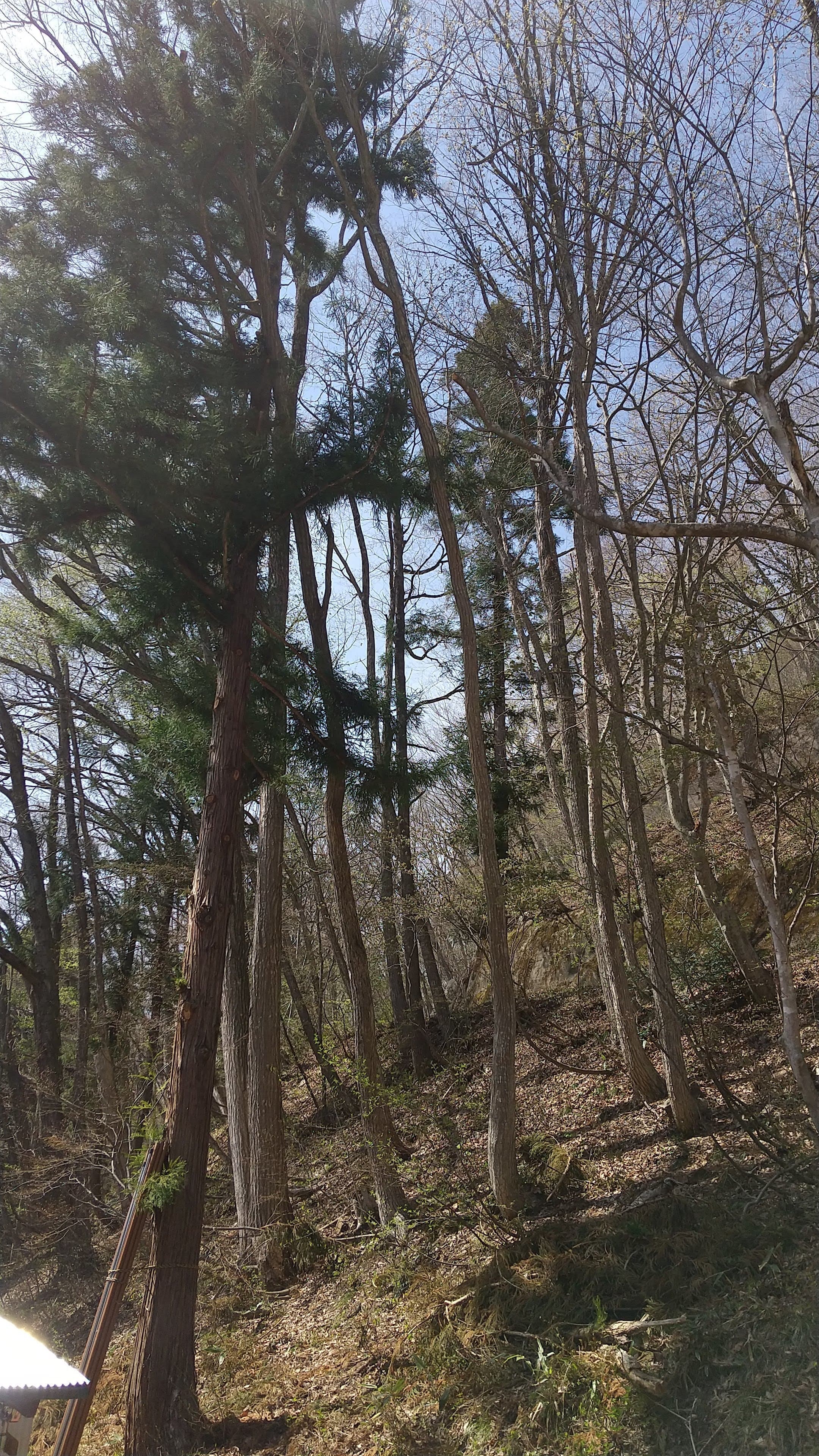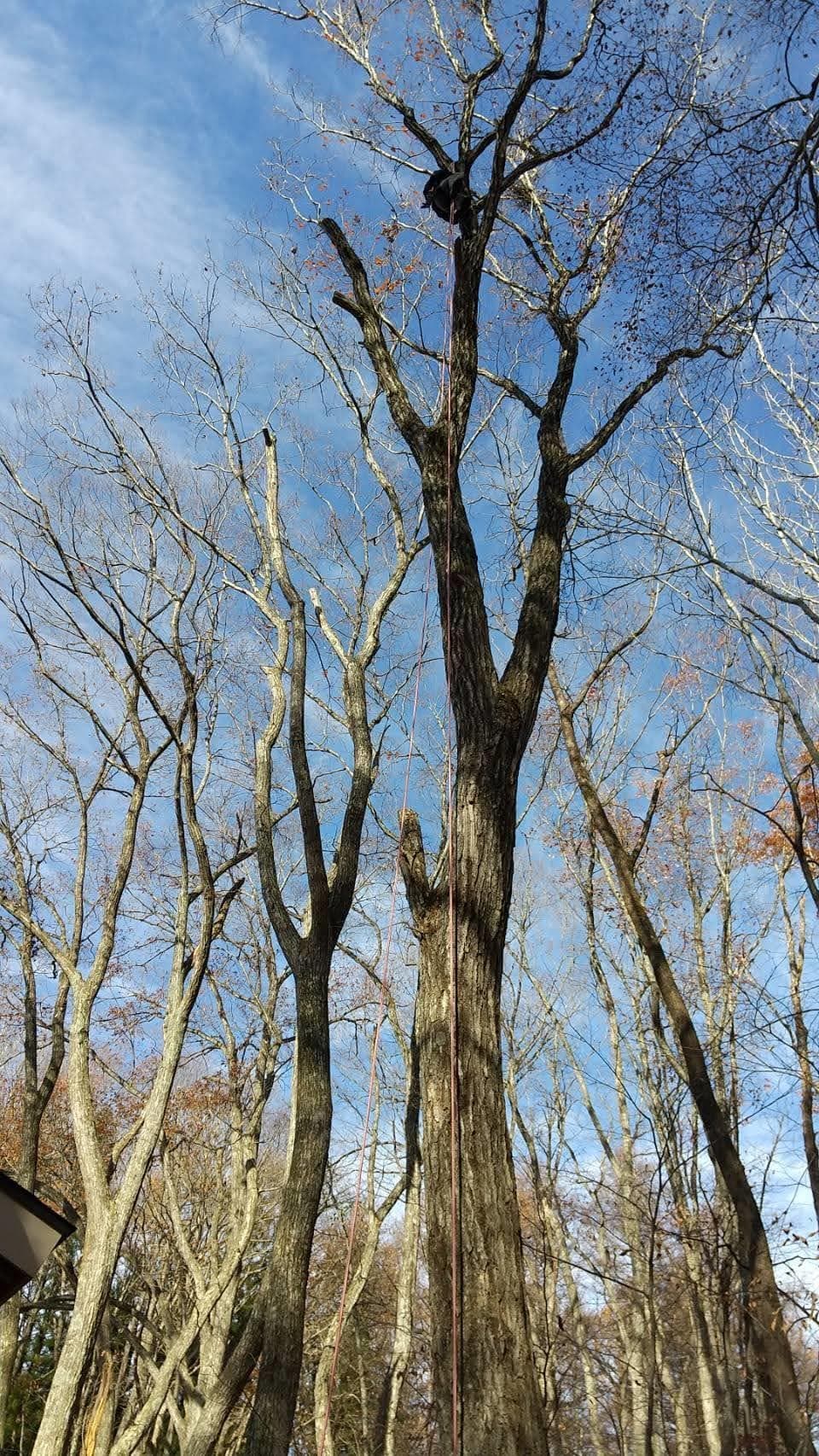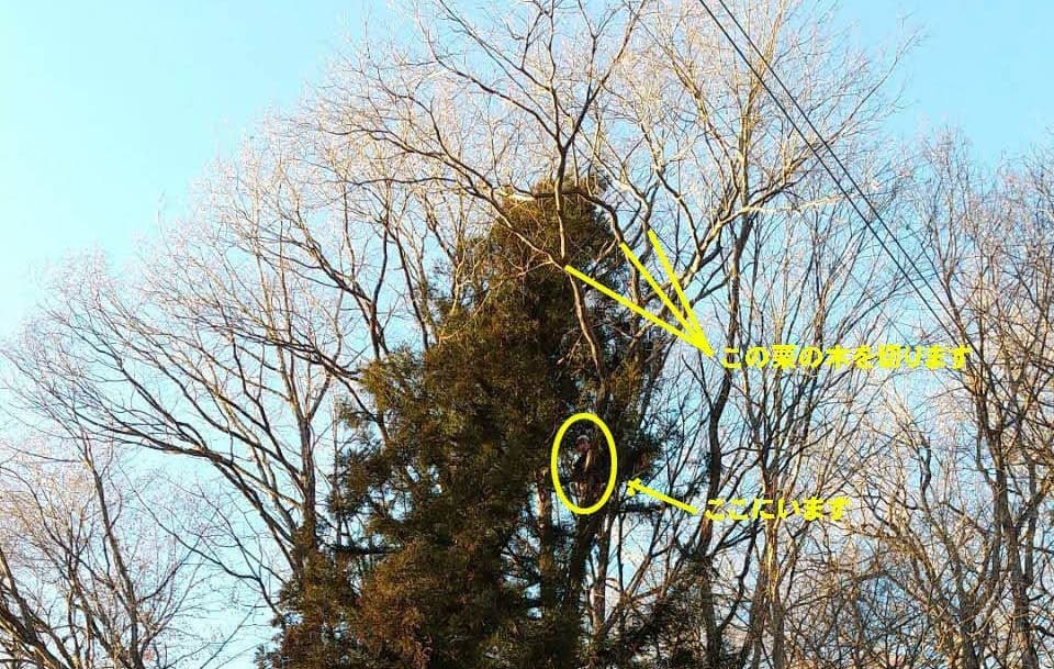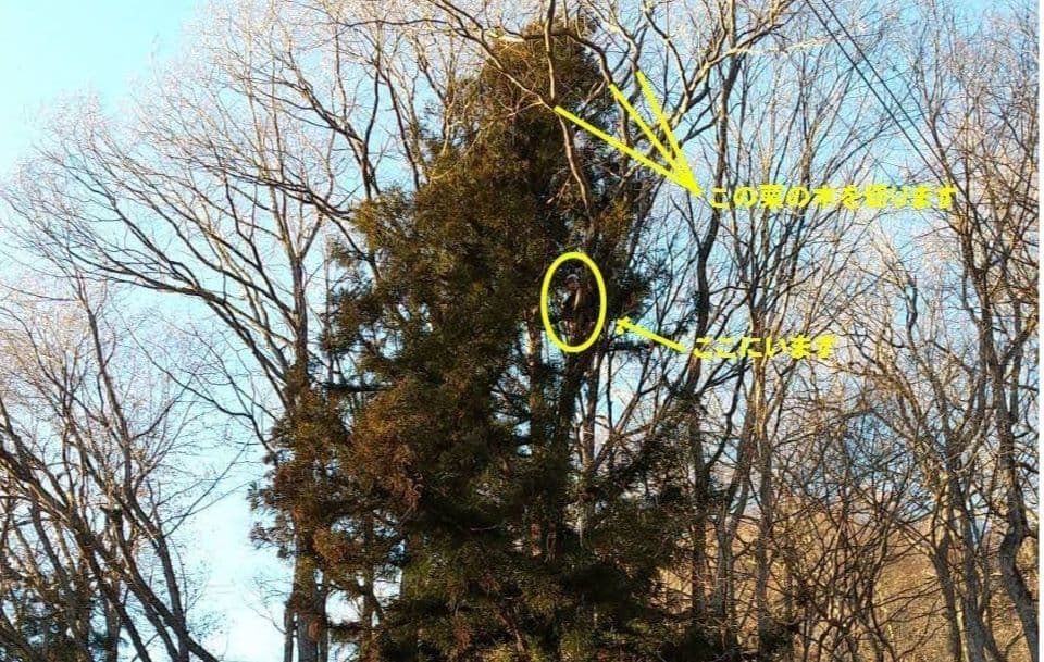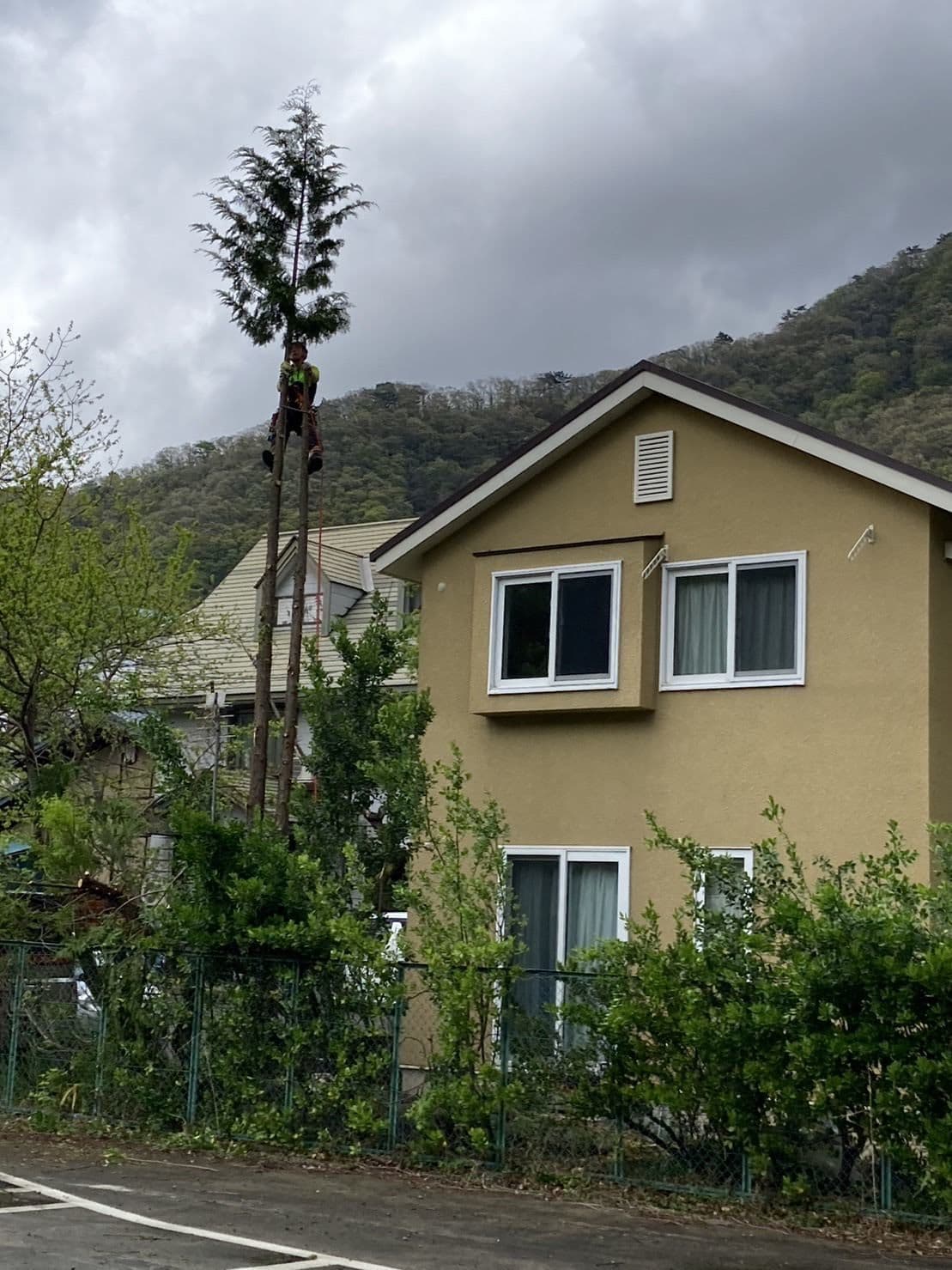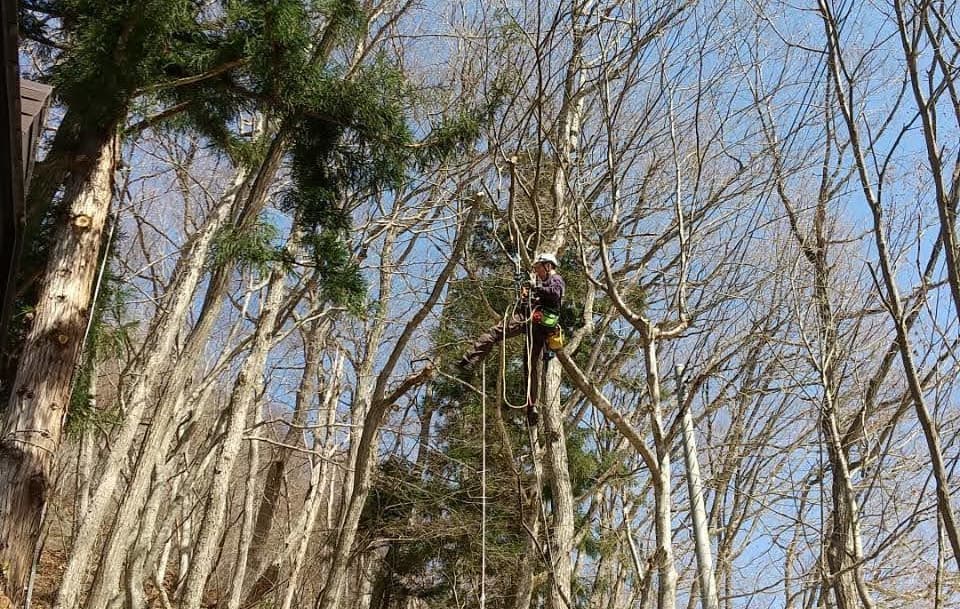 手伝いで、別荘の屋根に被さっていた枝の伐採。高さ15mほど。経験不足でまだ枝先の方までは行けなかった。回収できなかったロープとスローラインを後日回収しに行った時の写真。