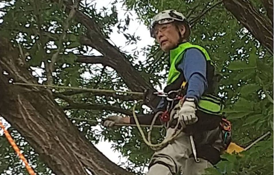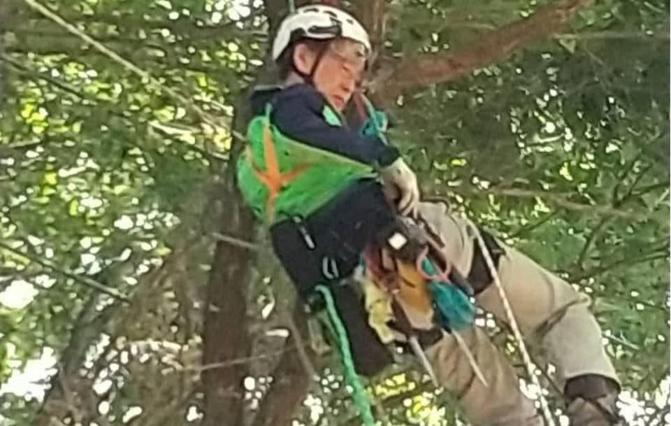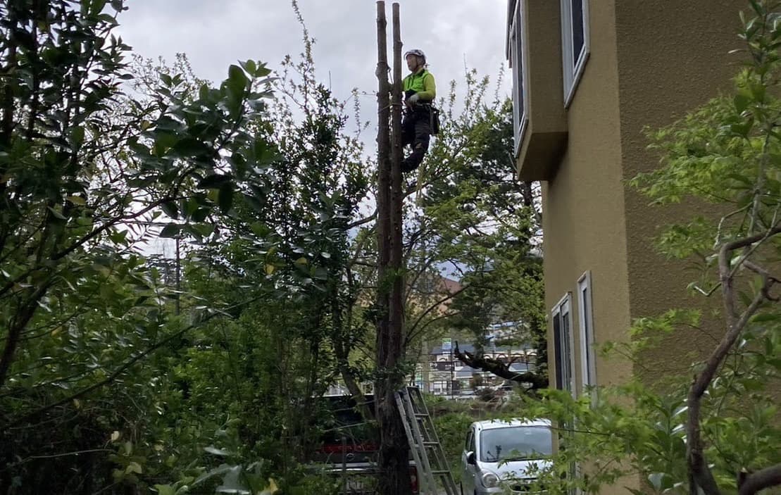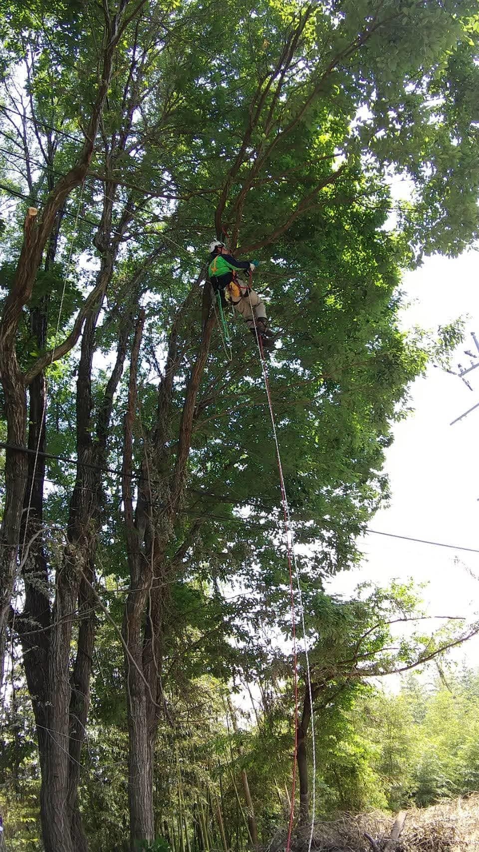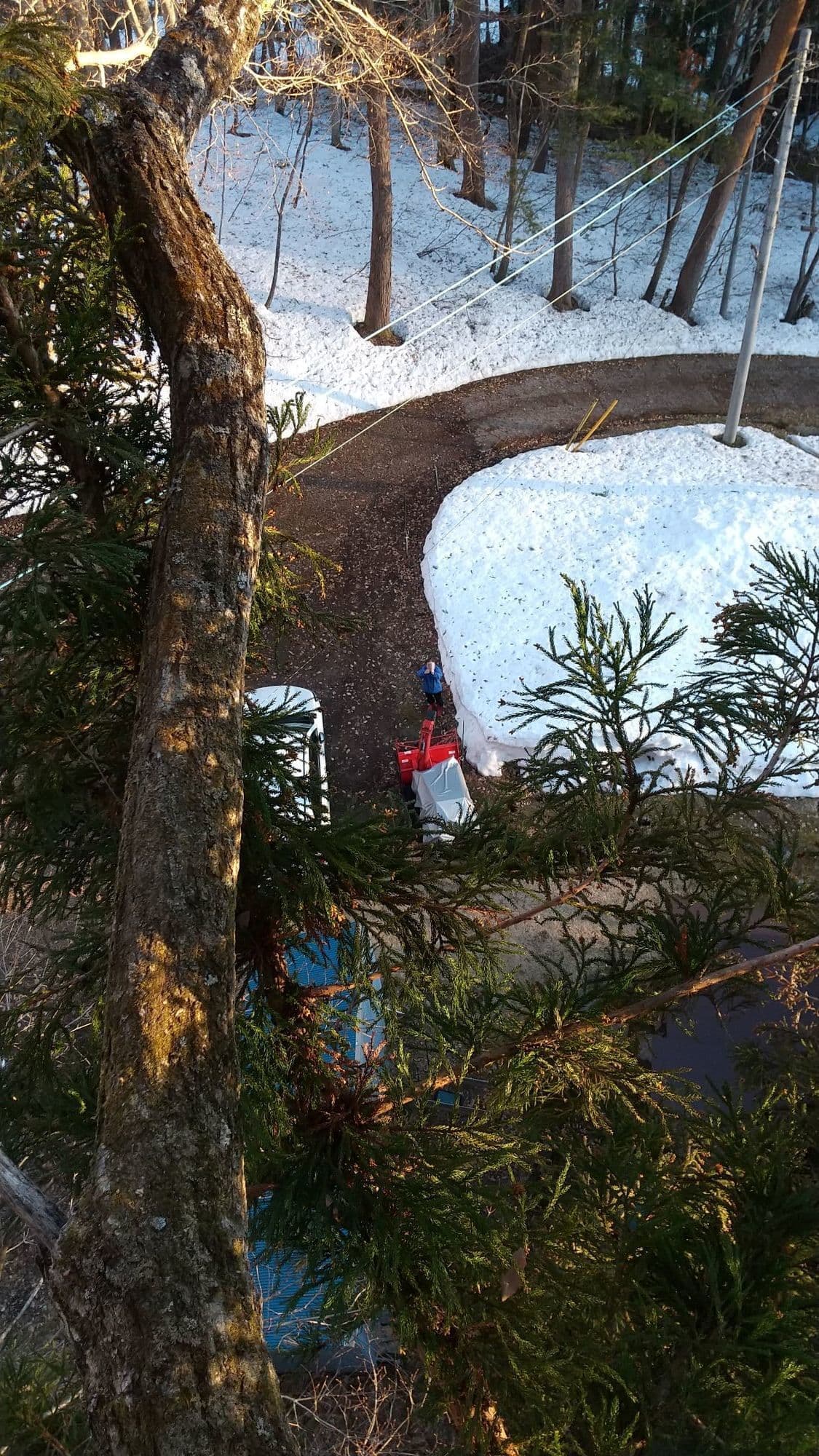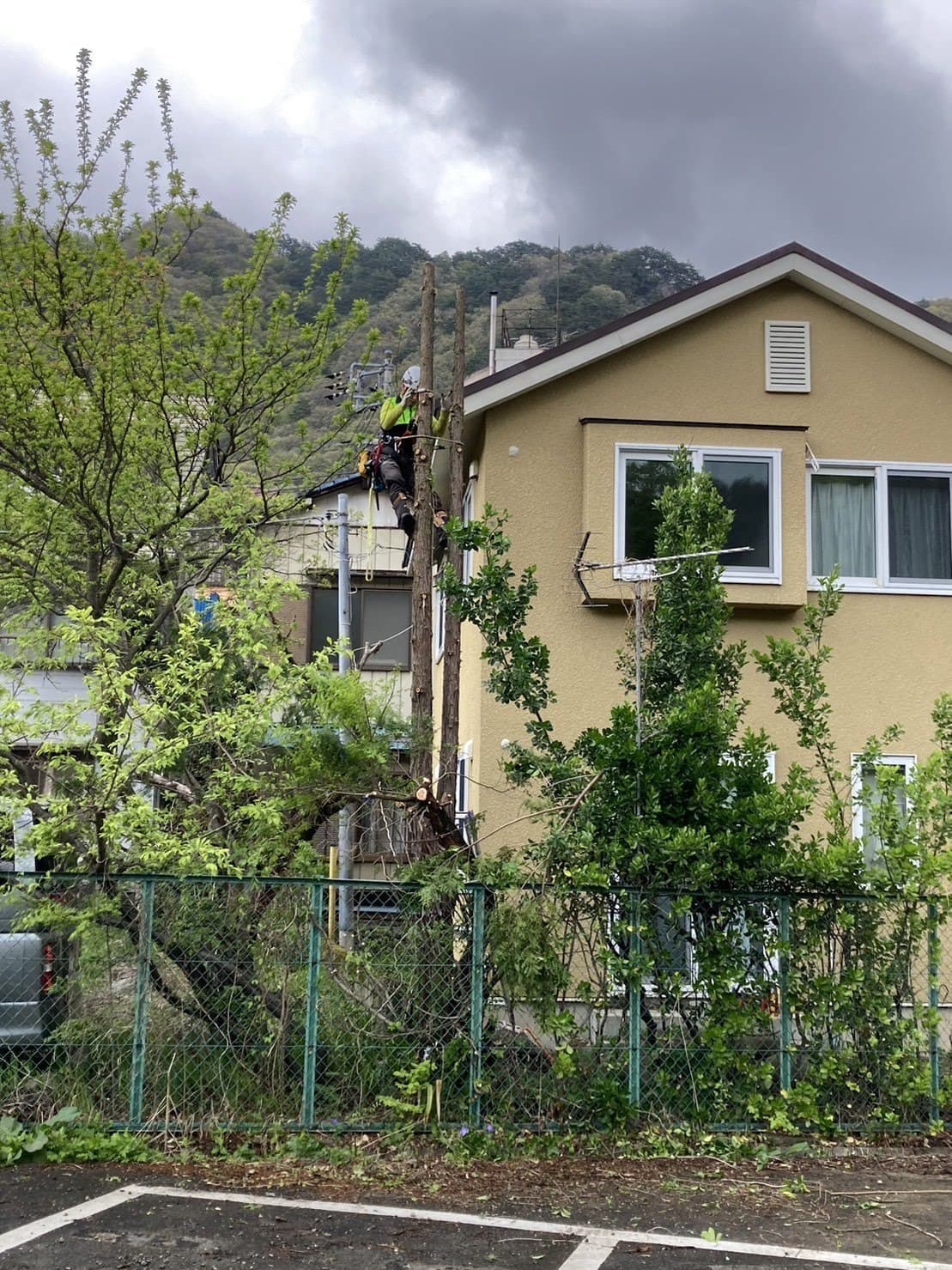 手伝いで、別荘の屋根に被さっていた枝の伐採。高さ15mほど。経験不足でまだ枝先の方までは行けなかった。回収できなかったロープとスローラインを後日回収しに行った時の写真。