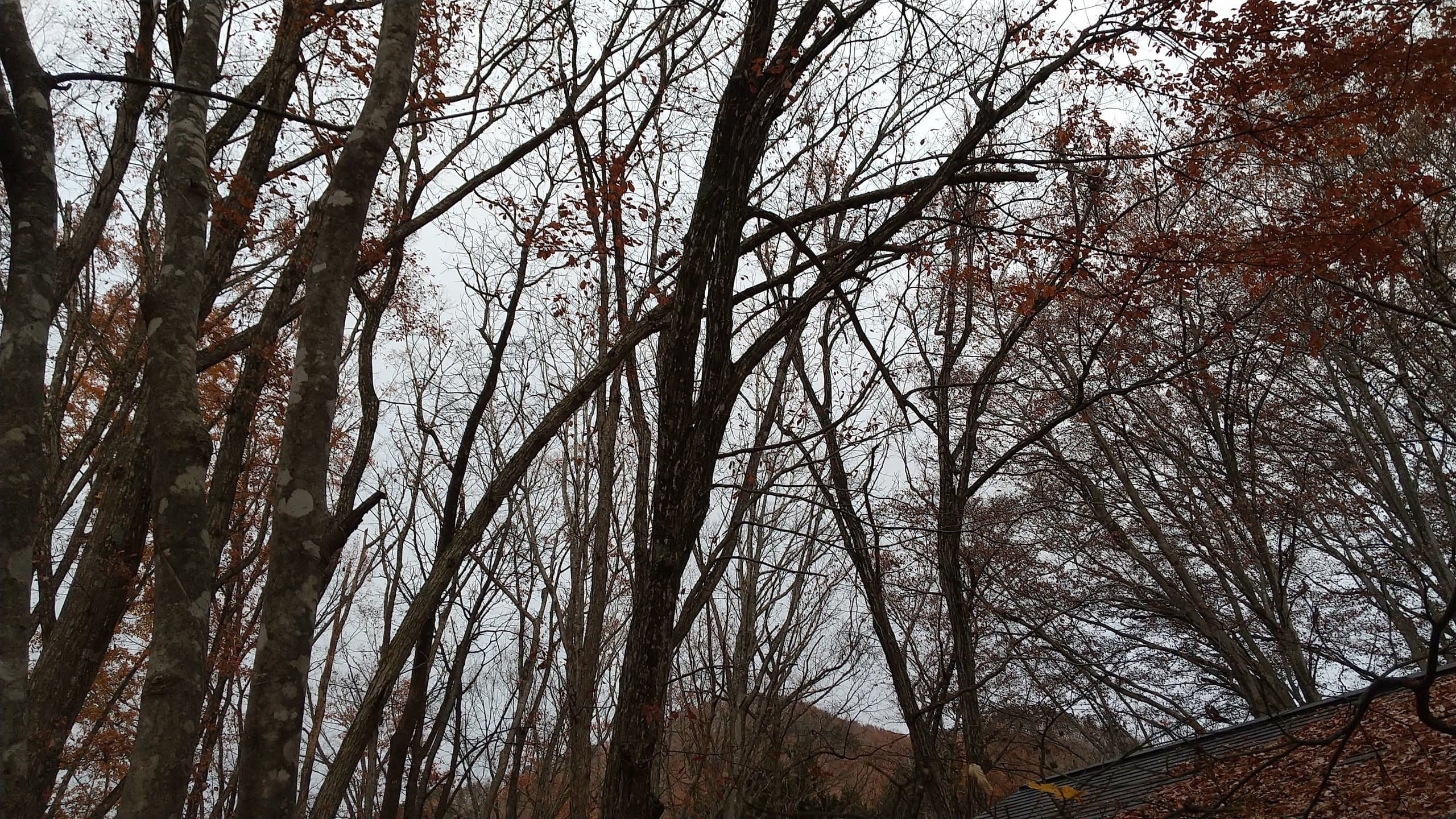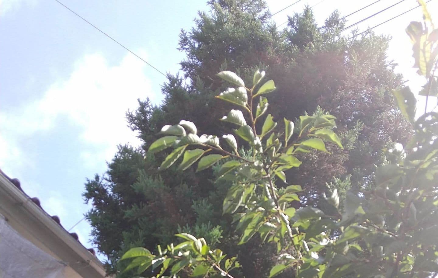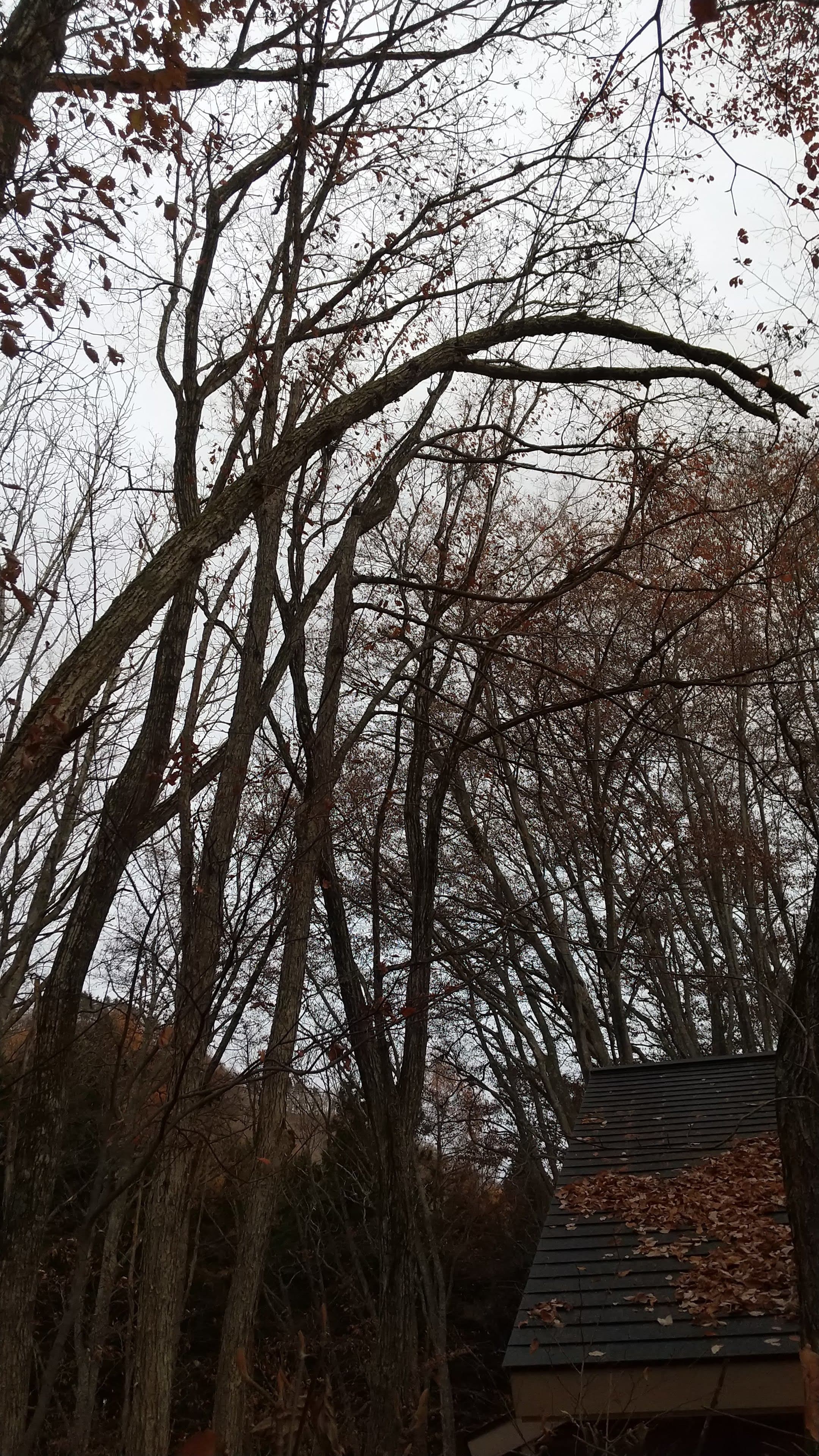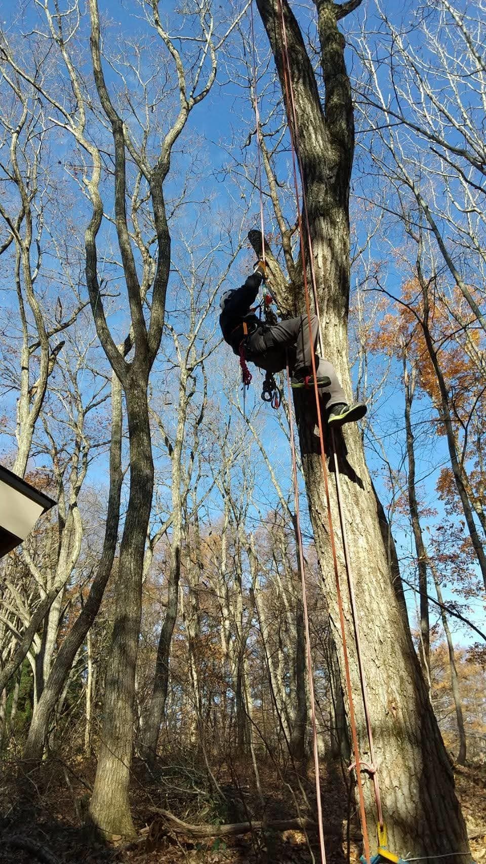 手伝いで、別荘の屋根に被さっていた枝の伐採。高さ15mほど。経験不足でまだ枝先の方までは行けなかった。回収できなかったロープとスローラインを後日回収しに行った時の写真。