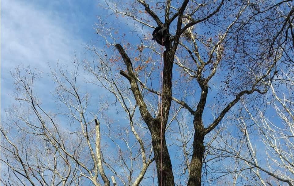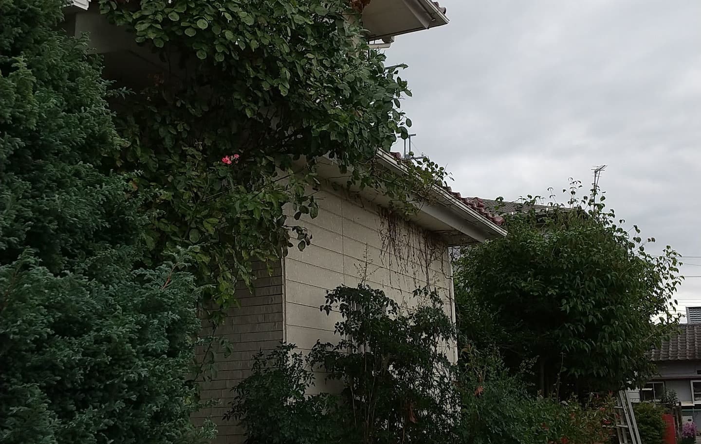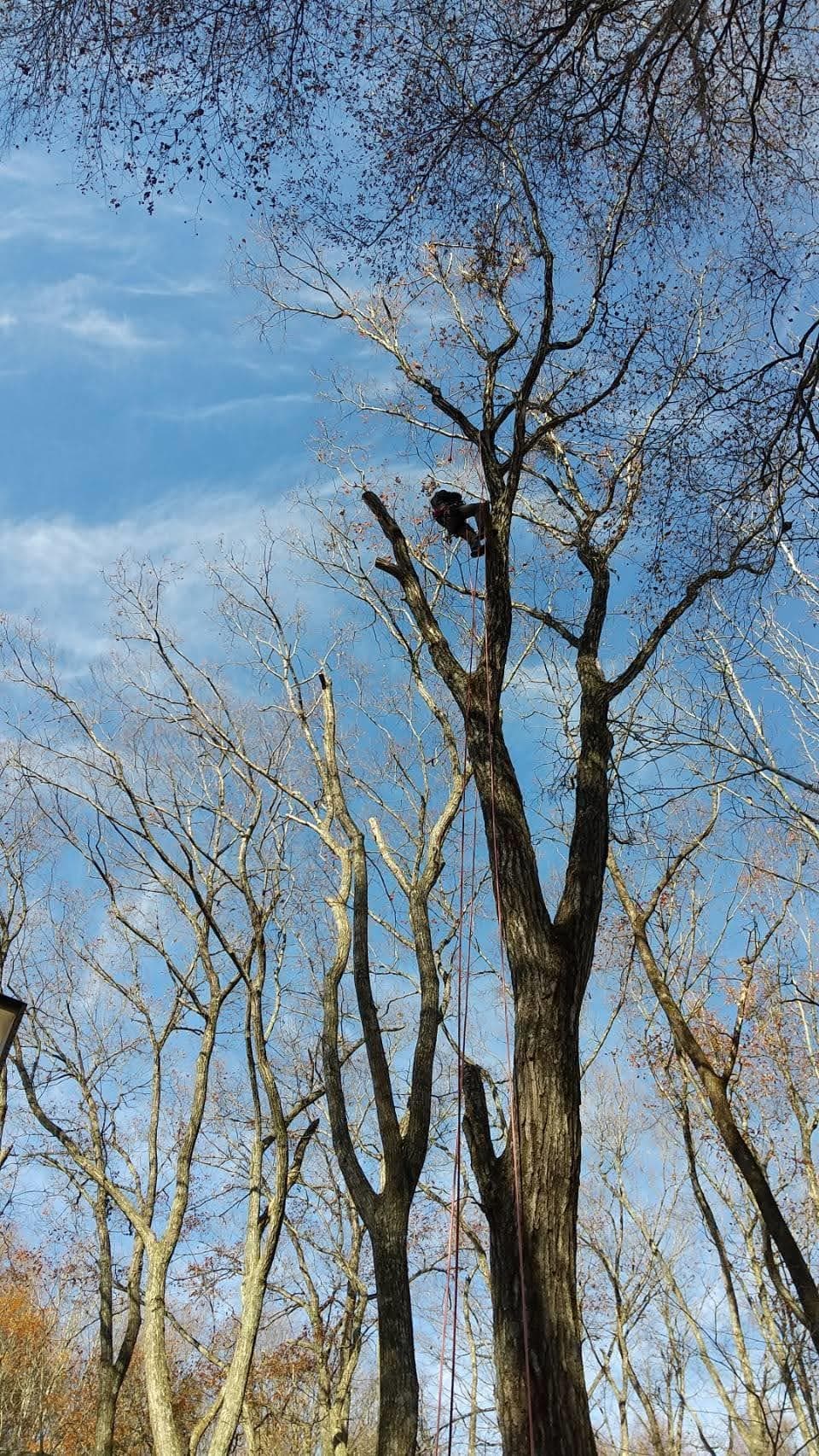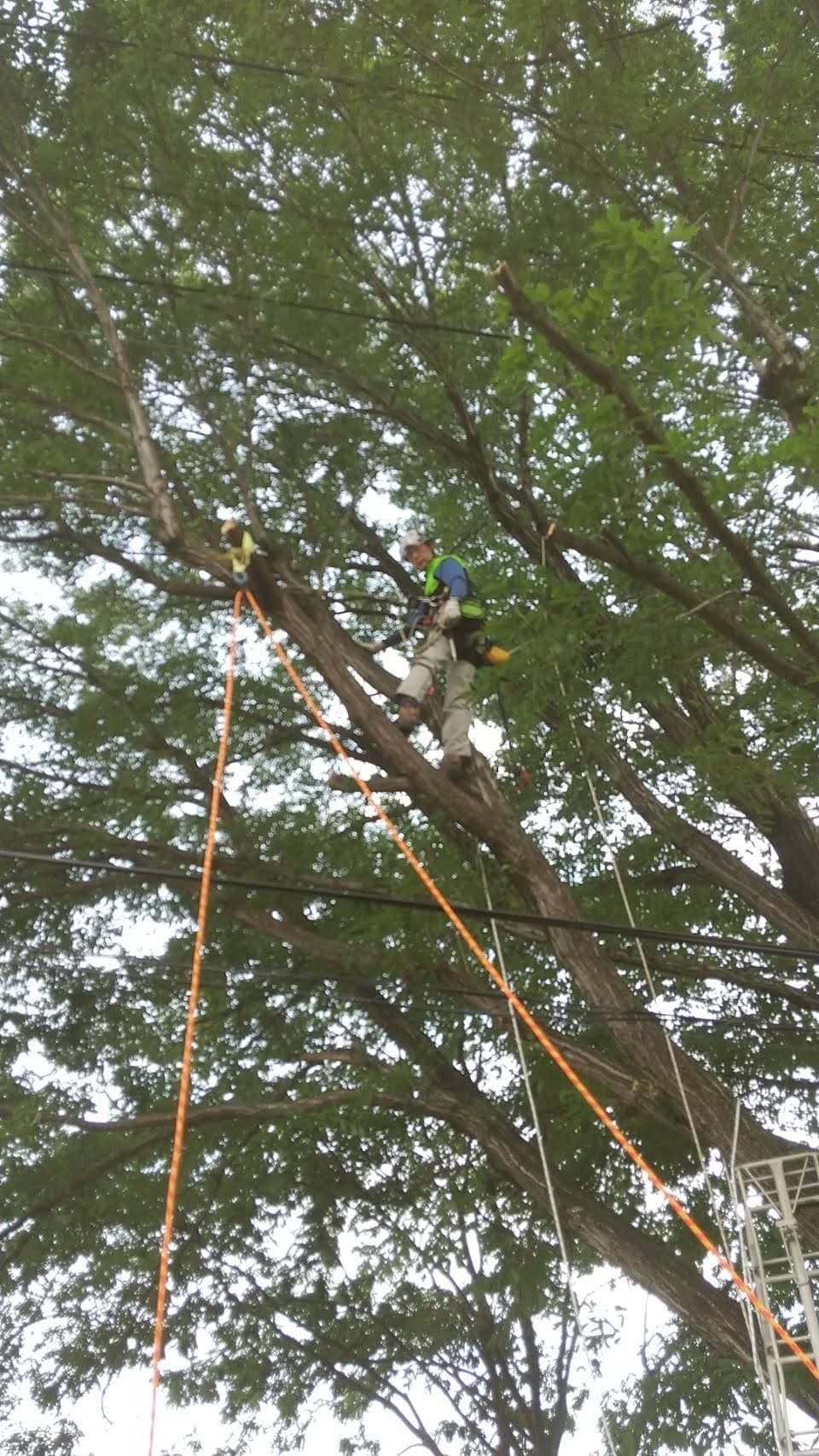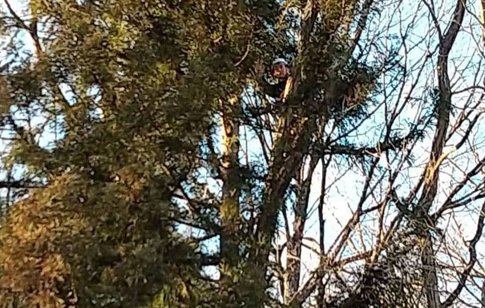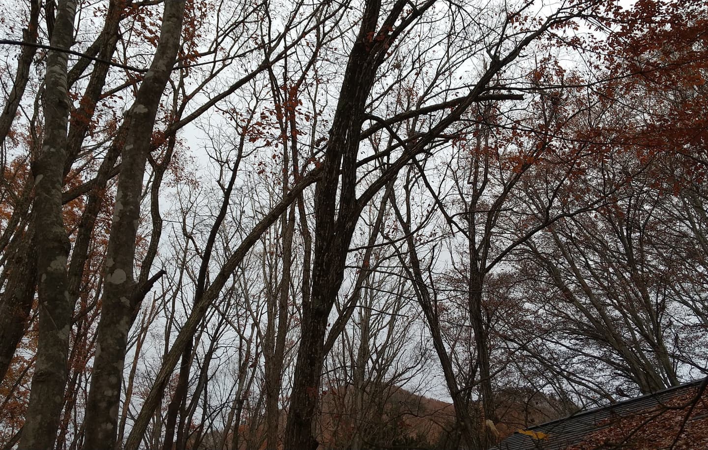 手伝いで、別荘の屋根に被さっていた枝の伐採。高さ15mほど。経験不足でまだ枝先の方までは行けなかった。回収できなかったロープとスローラインを後日回収しに行った時の写真。