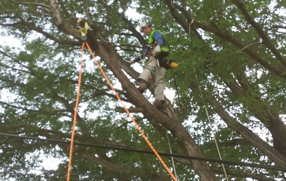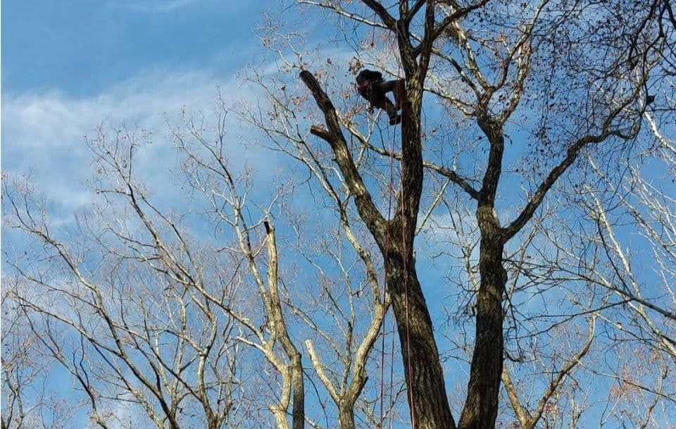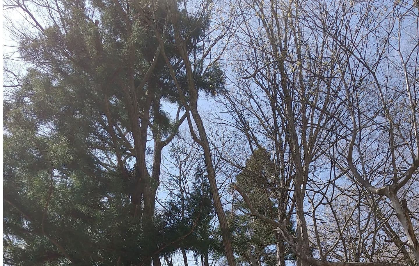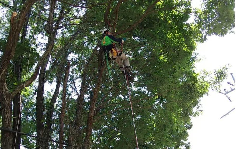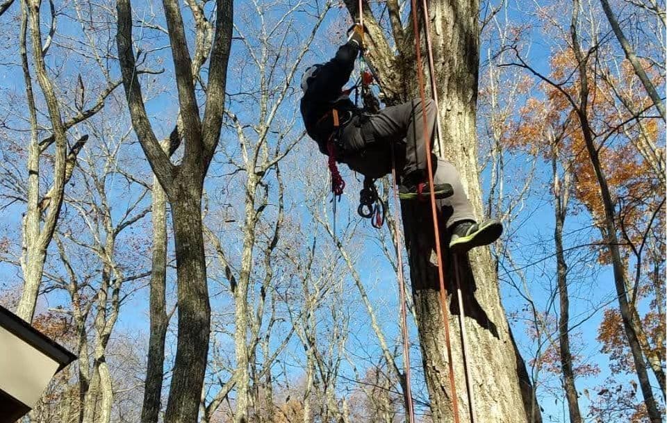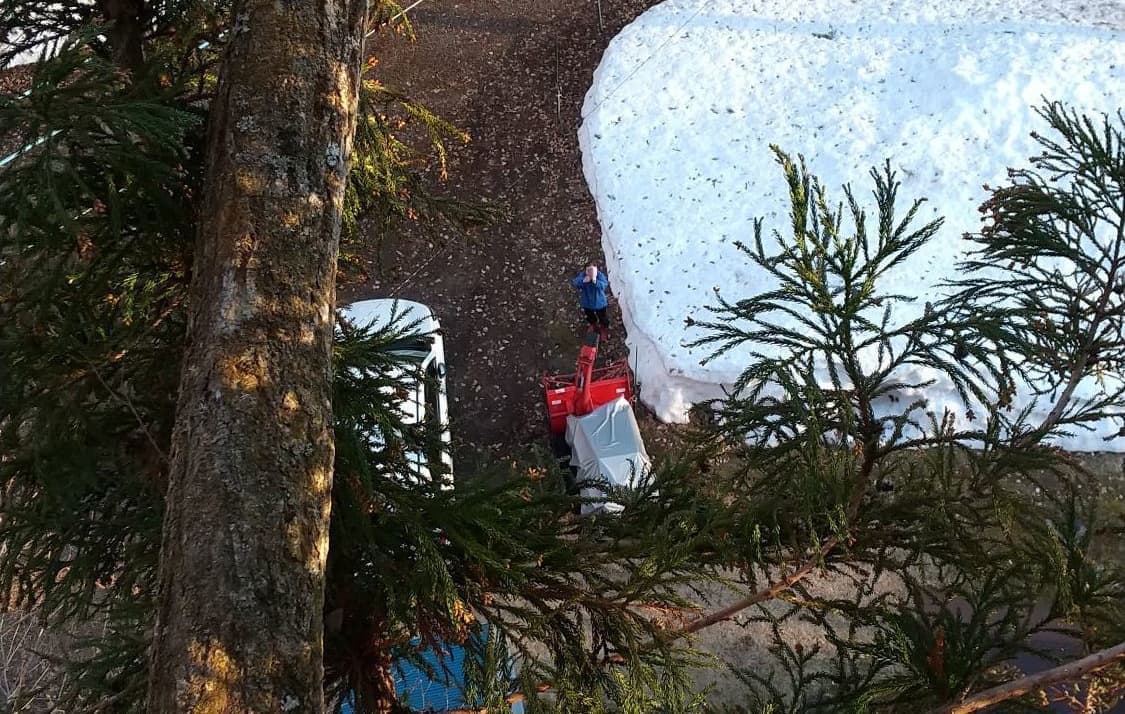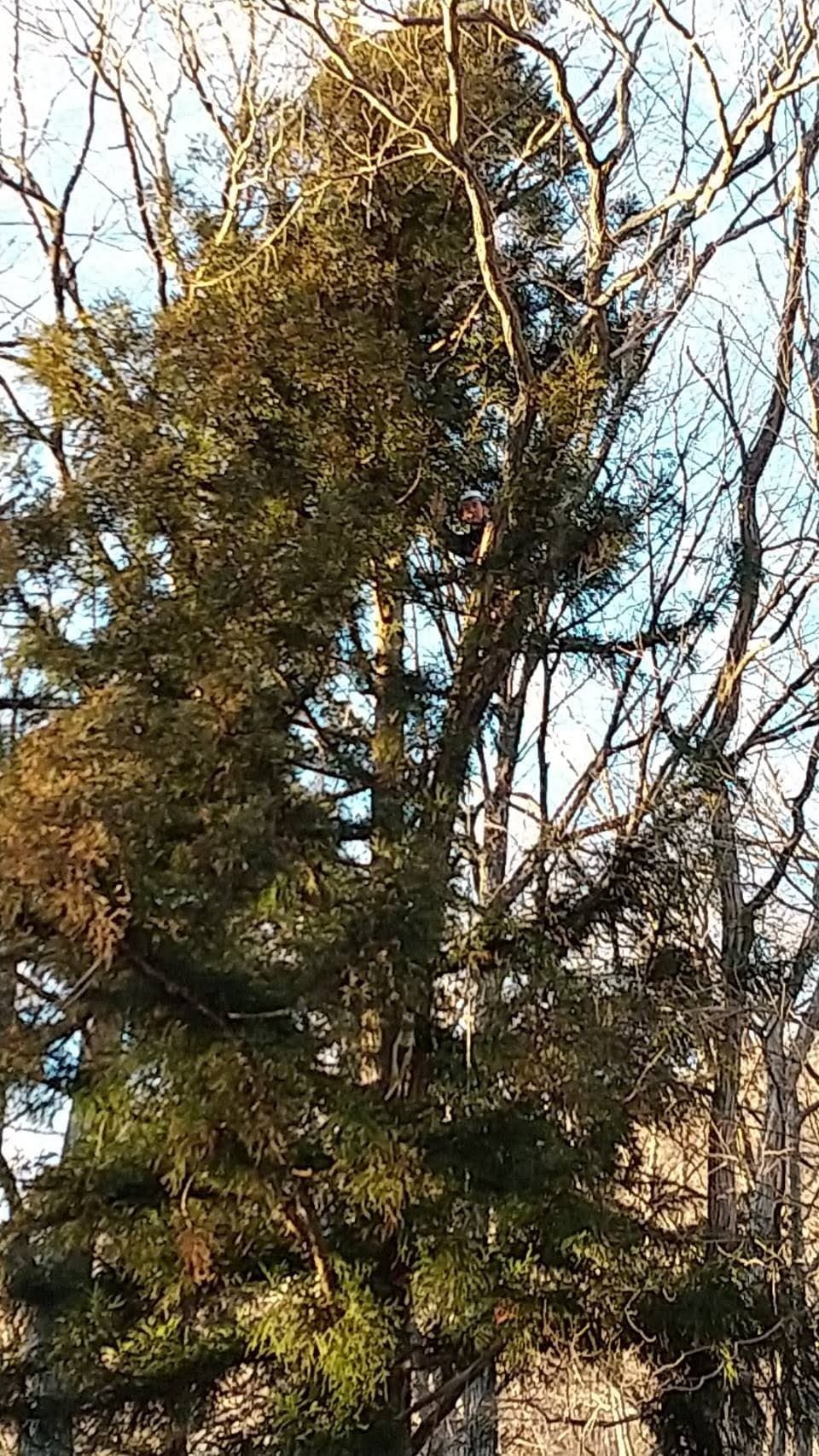 手伝いで、別荘の屋根に被さっていた枝の伐採。高さ15mほど。経験不足でまだ枝先の方までは行けなかった。回収できなかったロープとスローラインを後日回収しに行った時の写真。