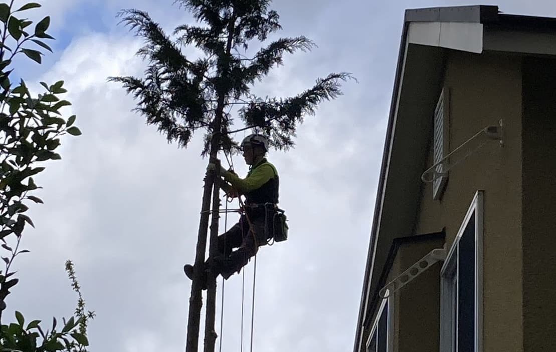 戸建て住宅庭のヒノキの伐採。上の方が細く二股。踏ん張っていたら内股の筋肉がつった。