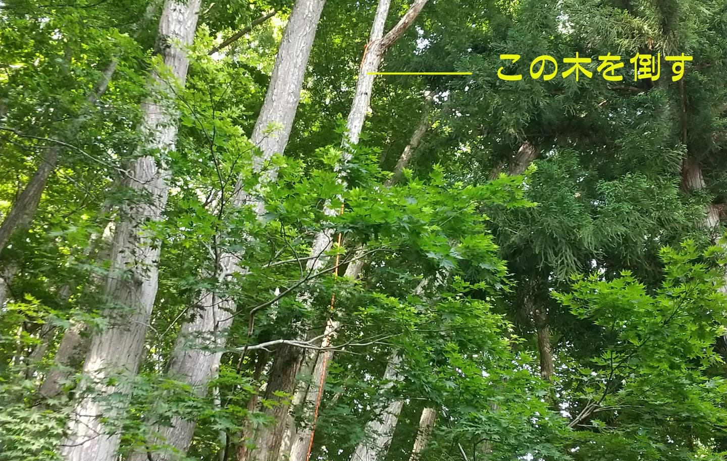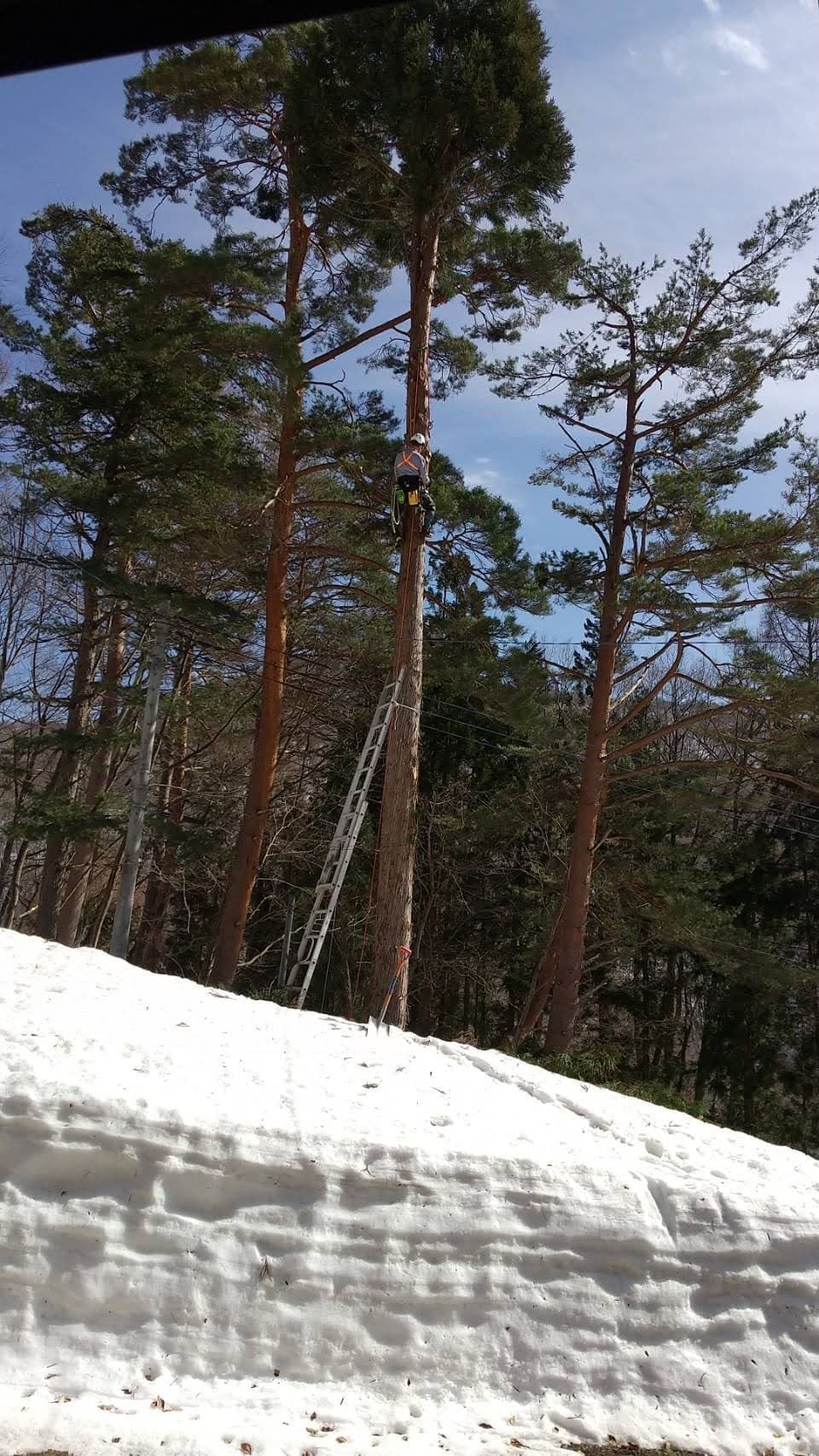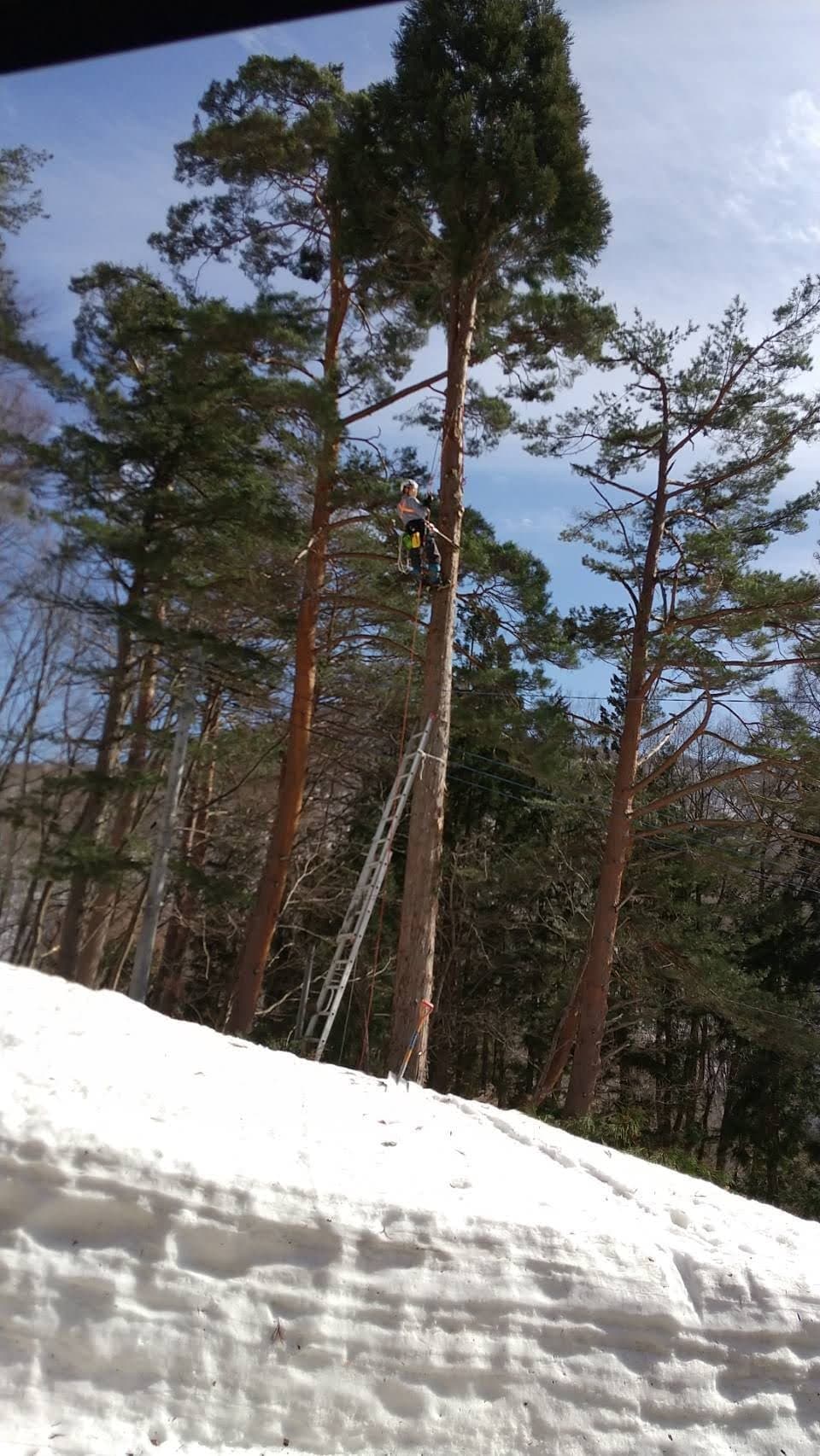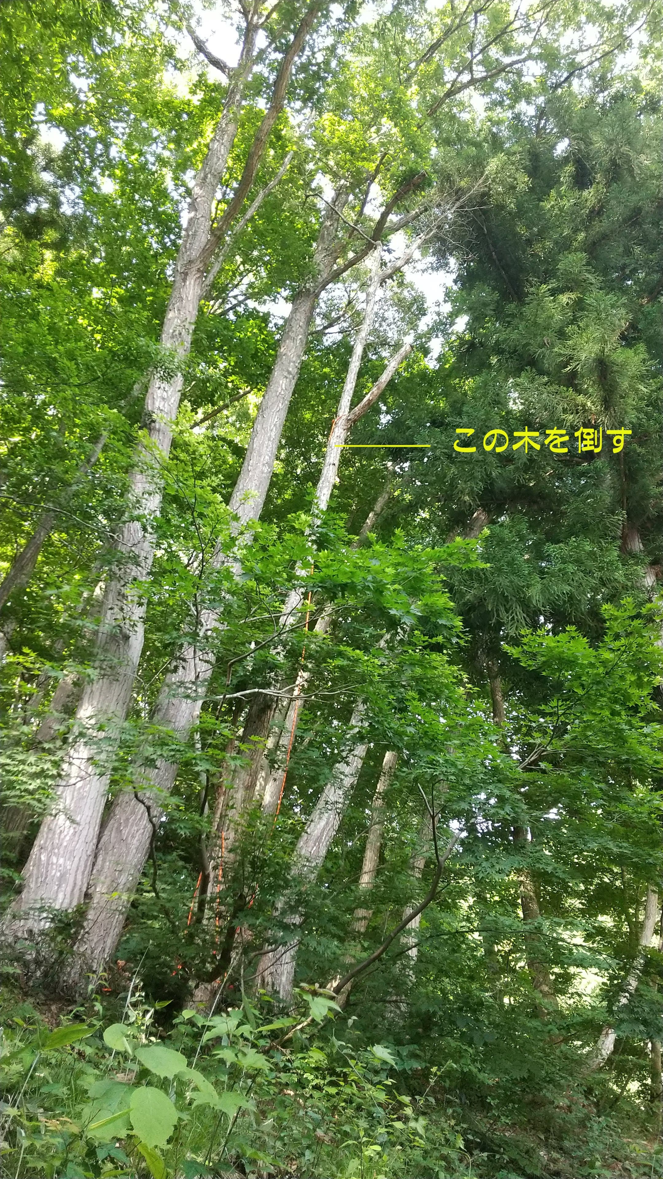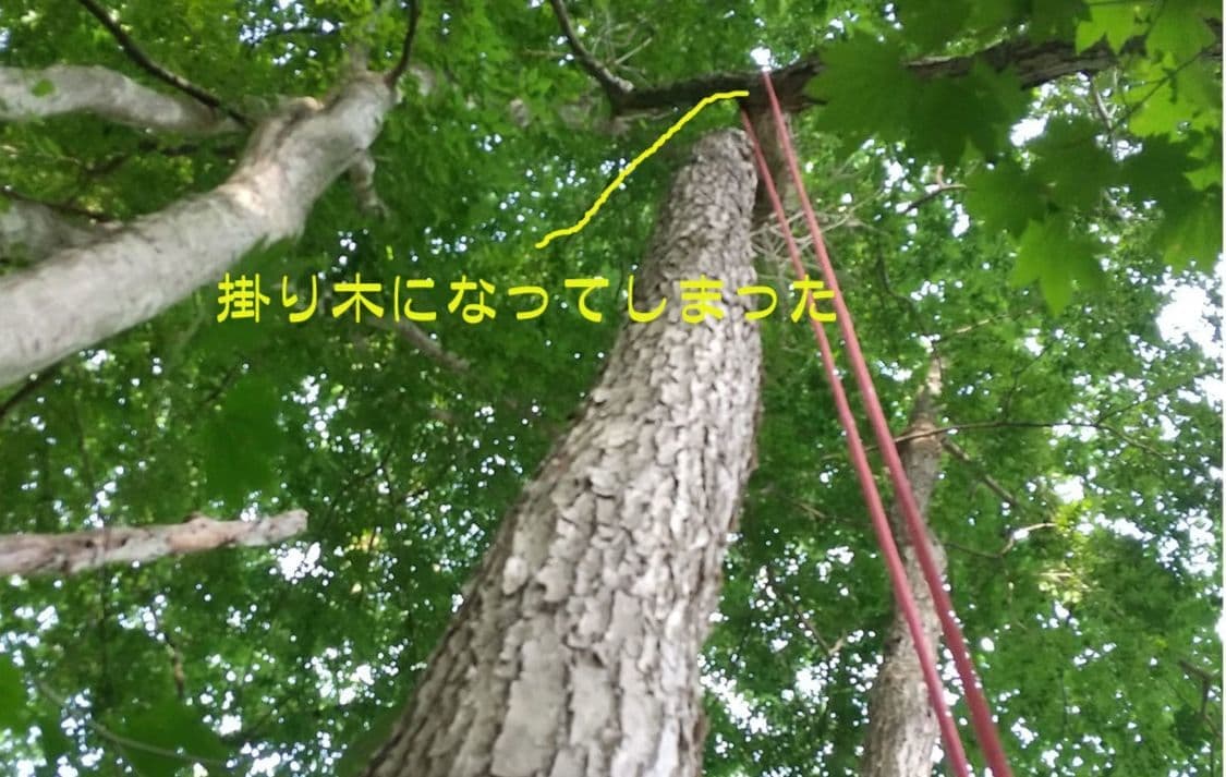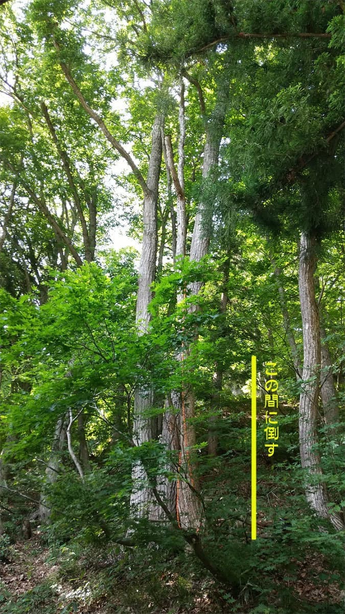 自宅の裏の枯れた木を伐採。2本目は掛り木になったのでドリルウインチを使用。