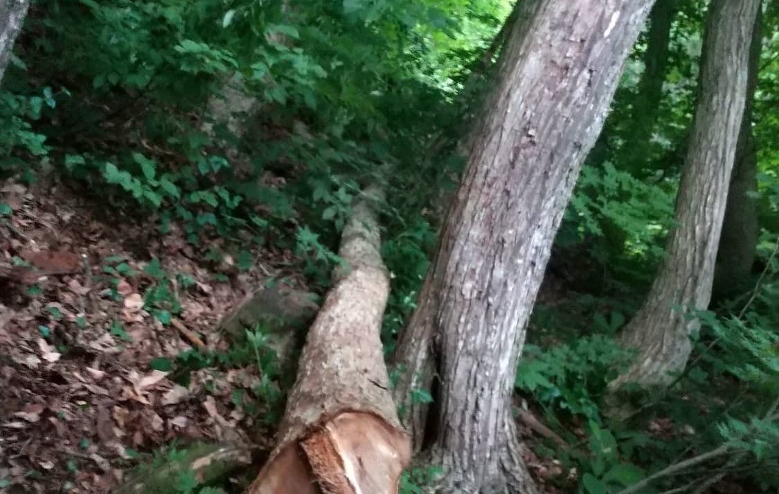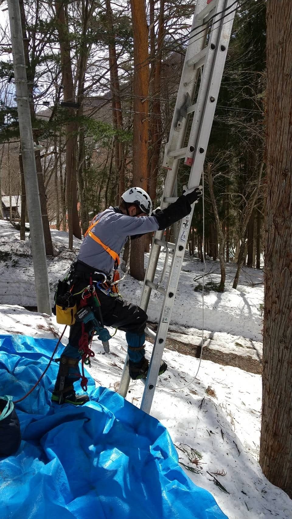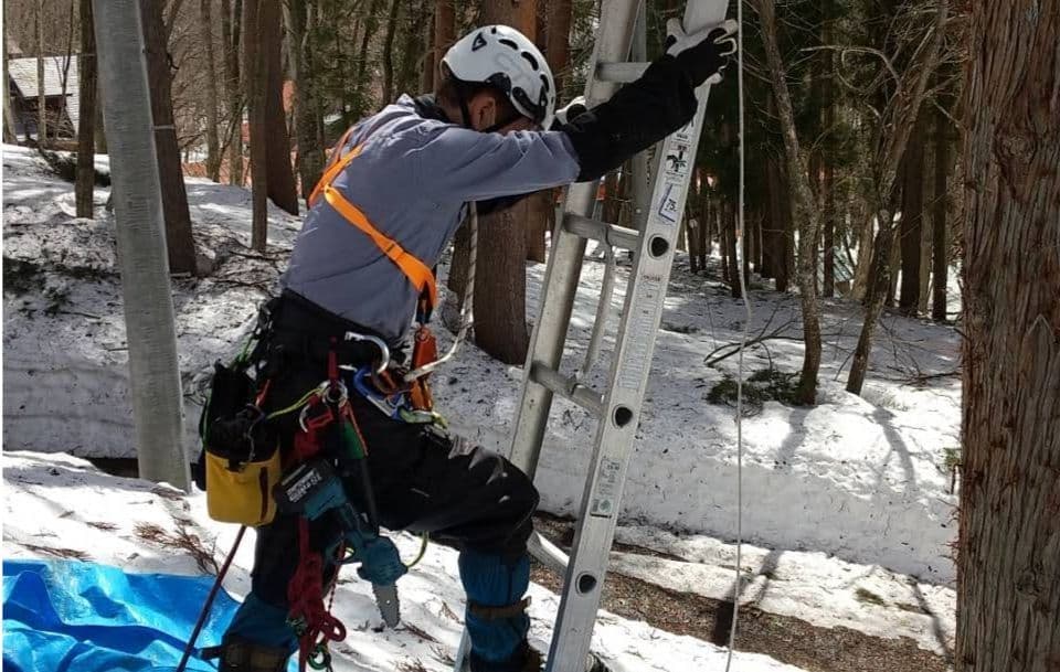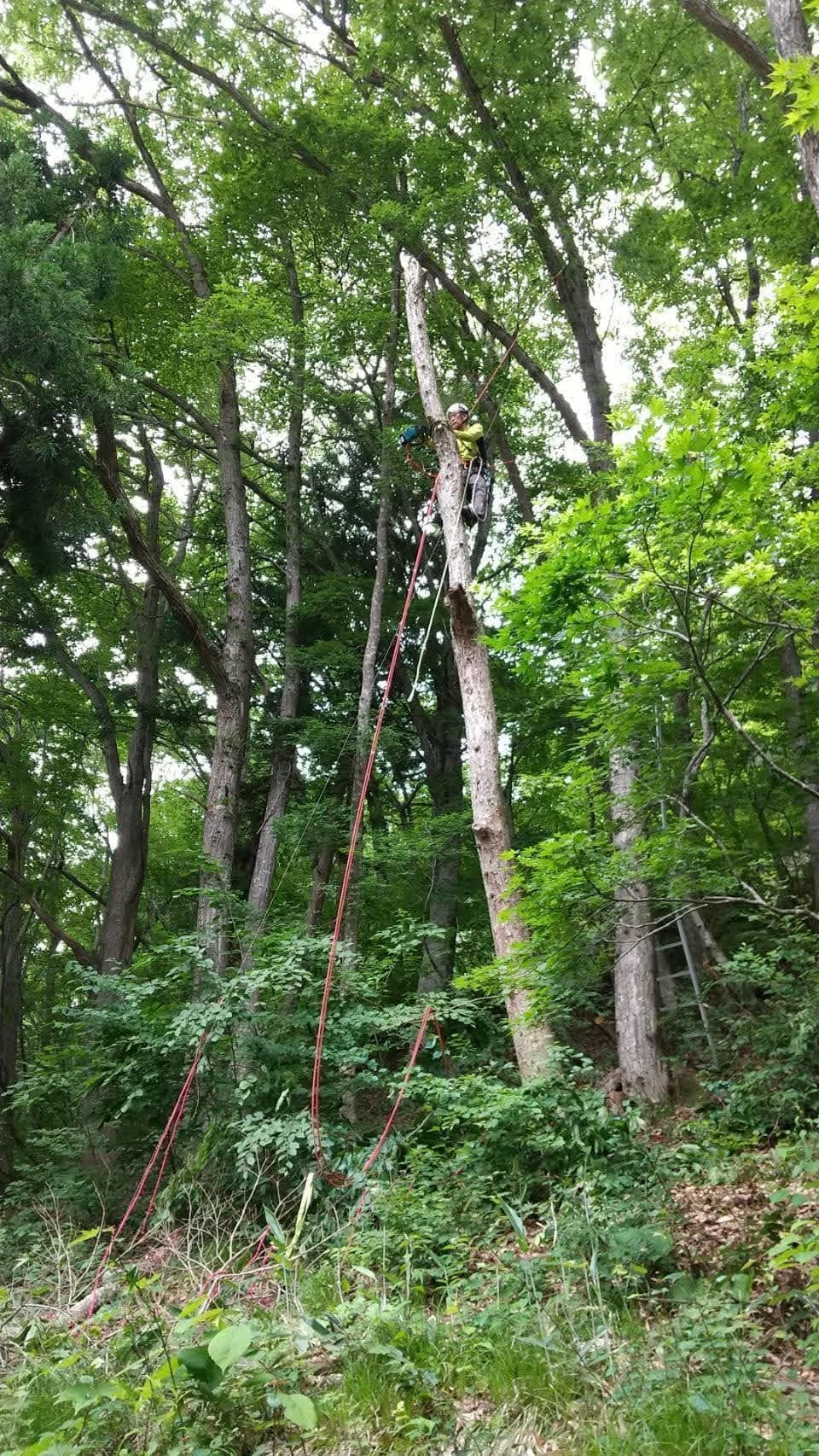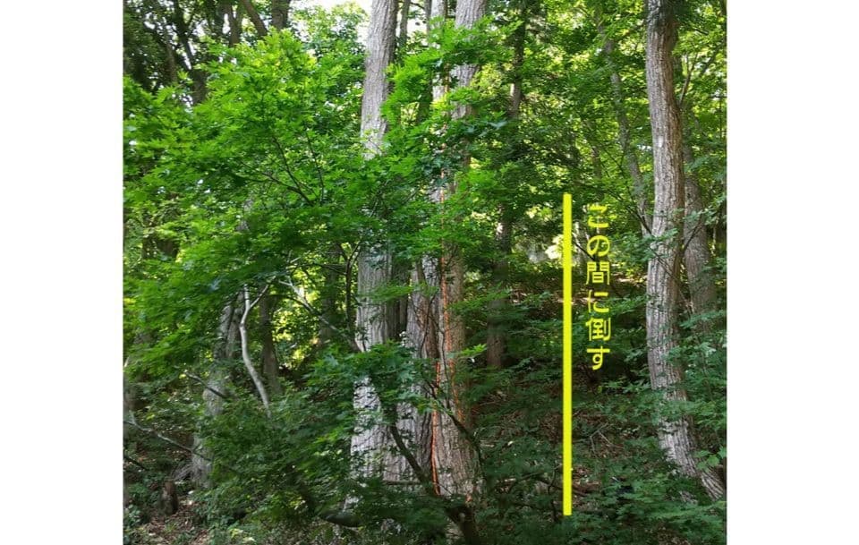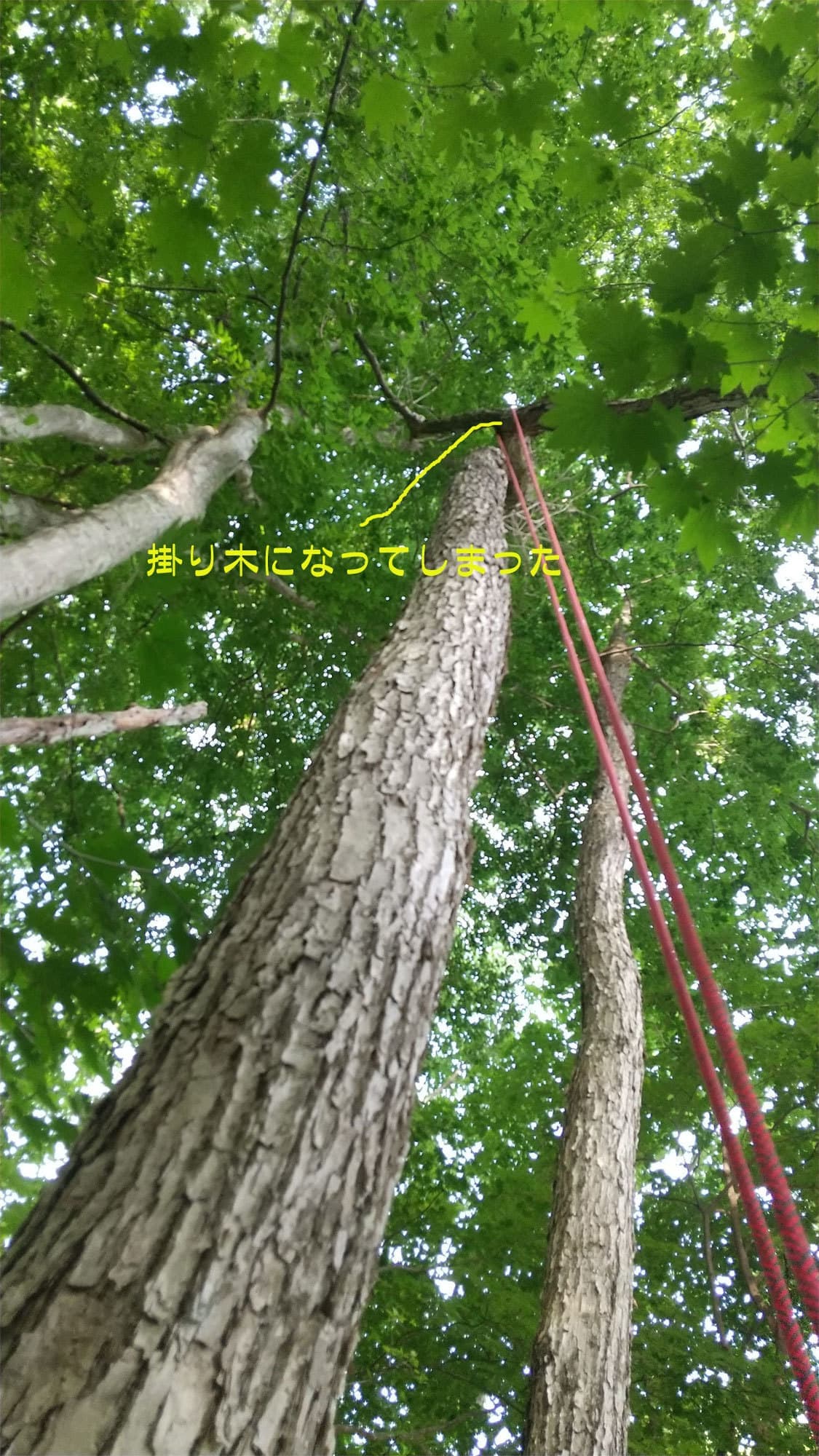 自宅の裏の枯れた木を伐採。2本目は掛り木になったのでドリルウインチを使用。