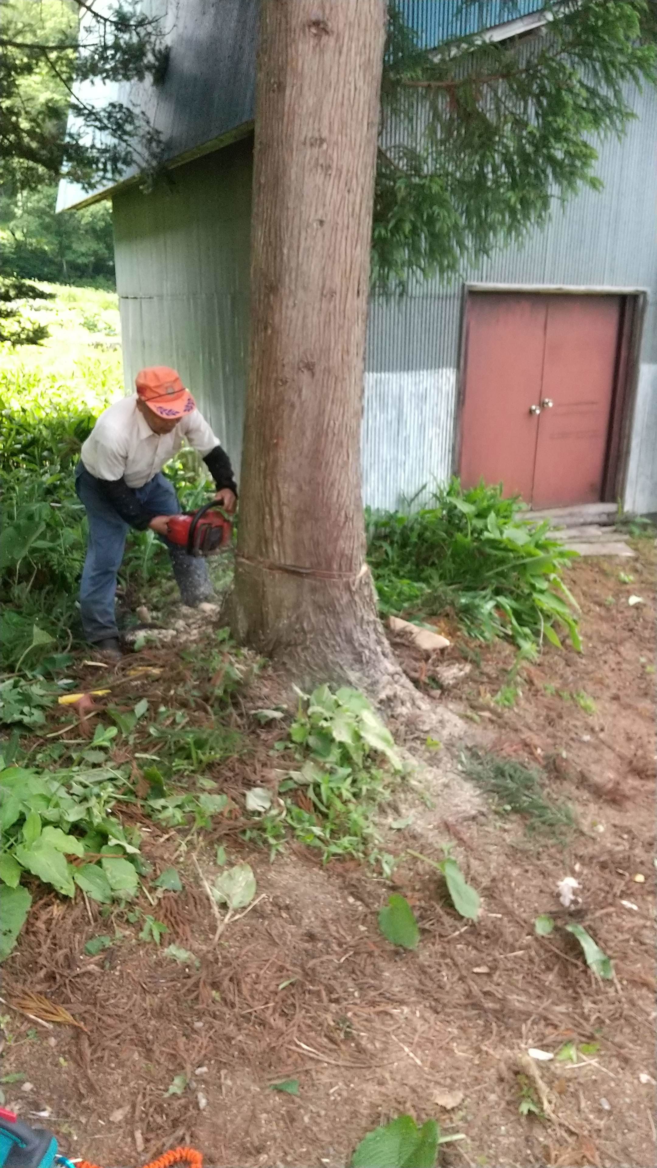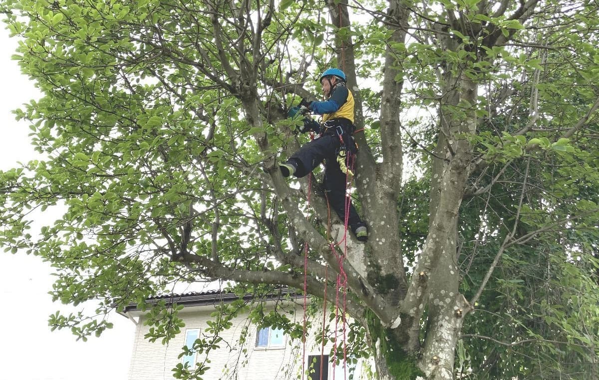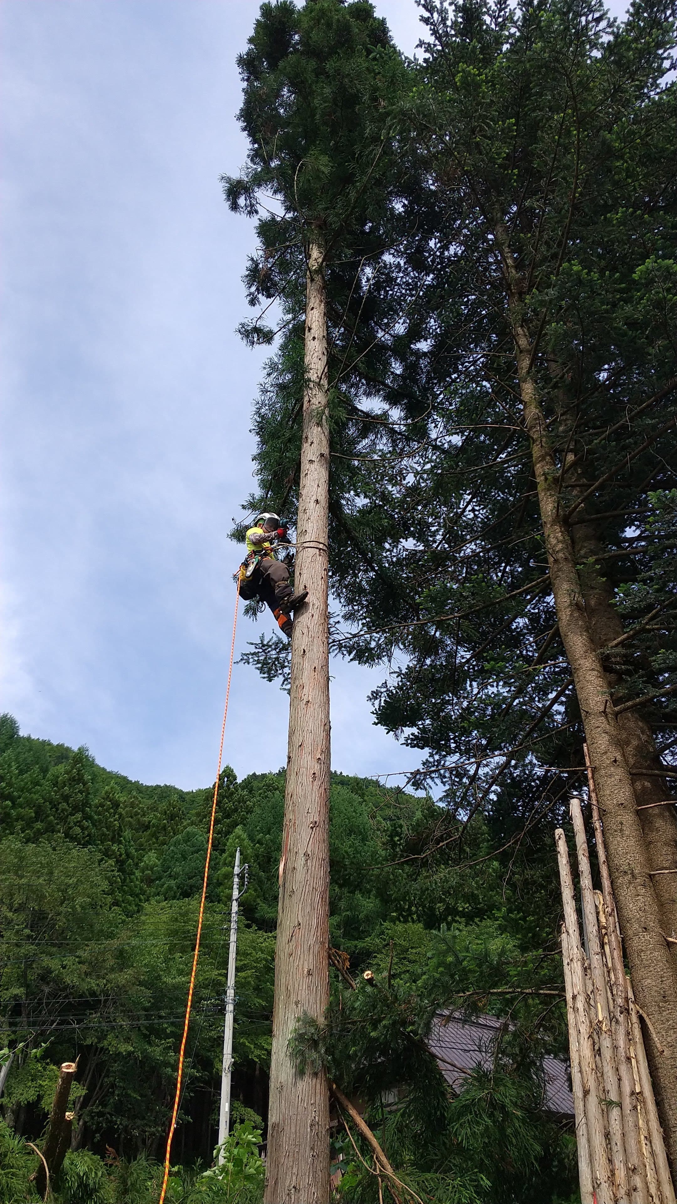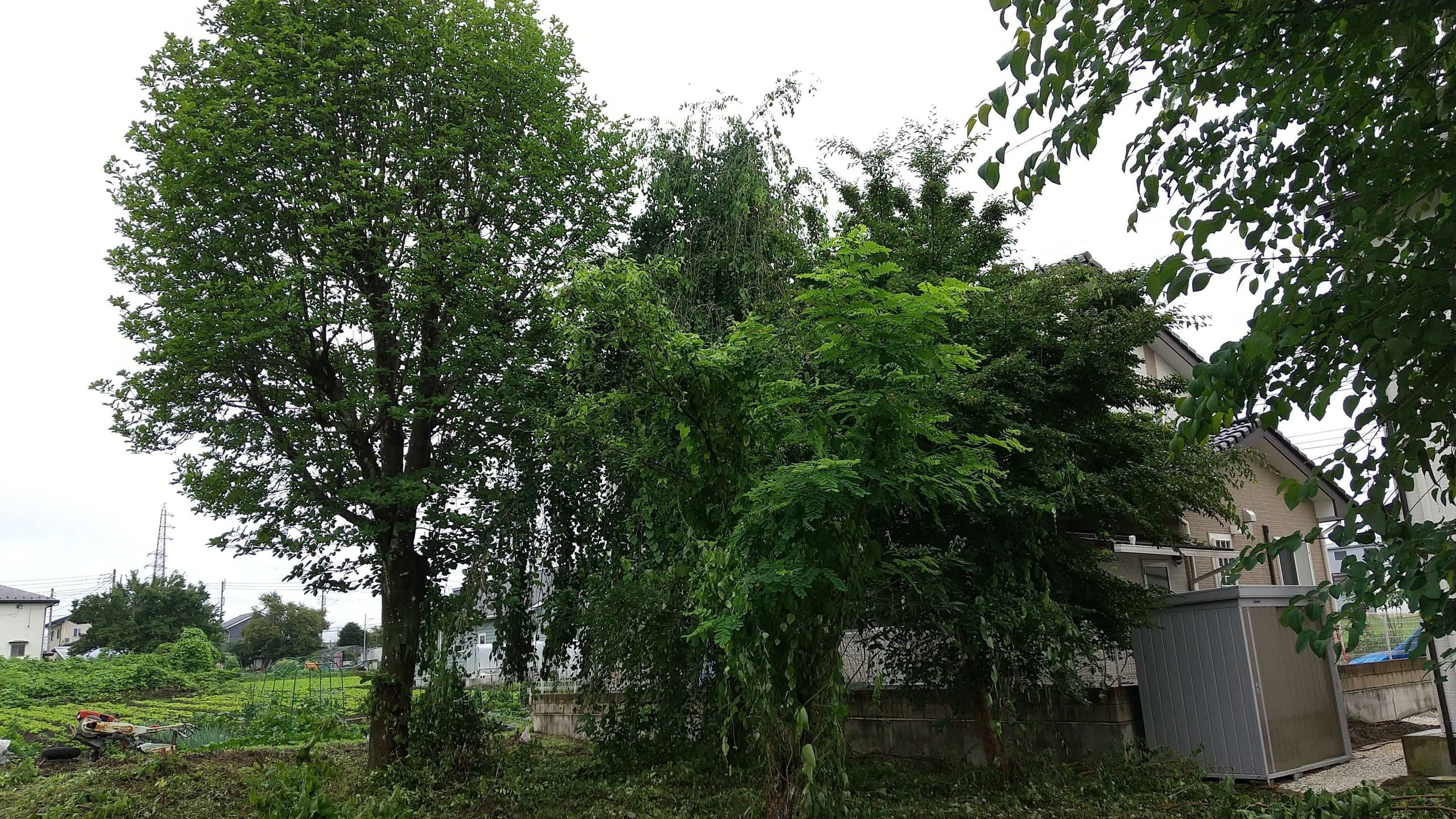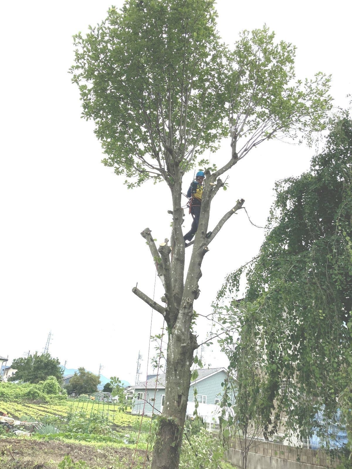 初めての手伝いの特殊伐採。空き家の庭に生えてる木の伐採。3~4mまで刻めば倒せるスペースがあったので、枝を落とすのも主幹を倒すのも楽だった。
