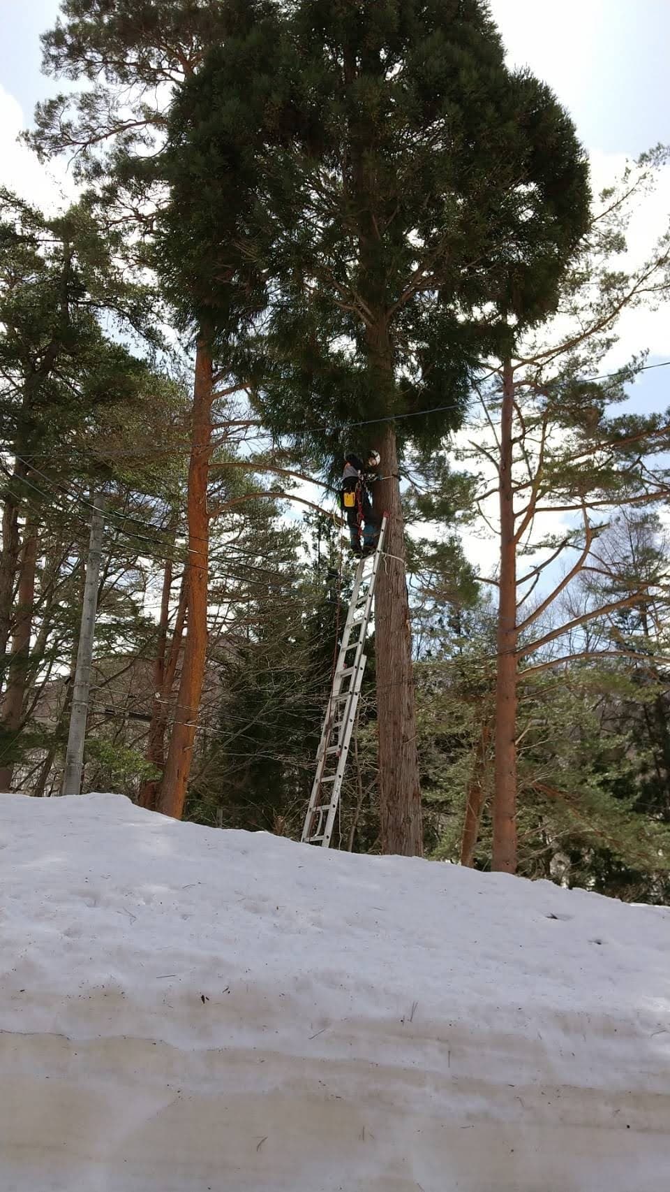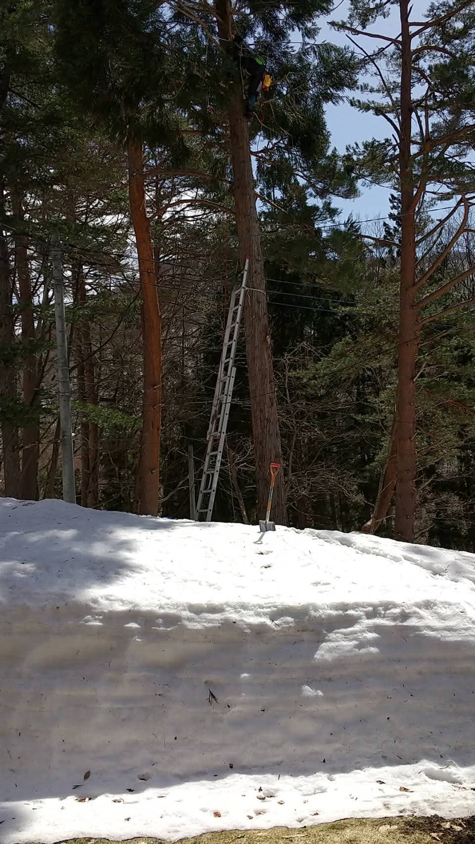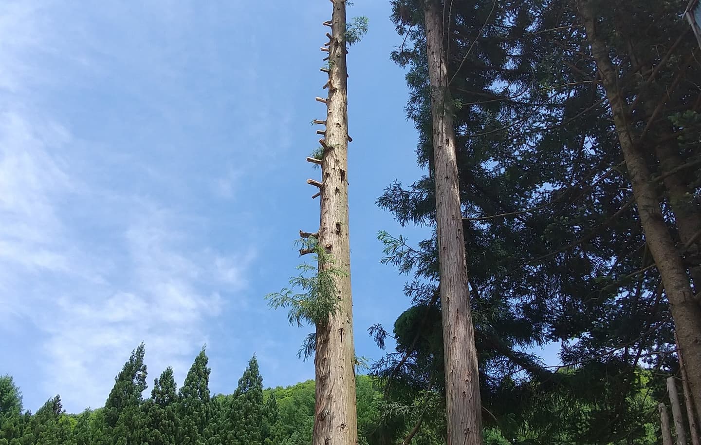 下の土地との境目擁壁上に生えている杉。まだ2m位の時に二本生えていたが、家に近かった一本はきりたおした。残した一本が15mを超えるほどになってしまった。擁壁のコンクリートも根によって割れてきた。これ以上放置できないということで、とりあえず上の方で生い茂っている枝を、特殊伐採の練習はじめで伐ってみた。今思えば、このときにトップカットまでしておけば良かったのだが、始めたばかりで道具も技もなかったので残念。