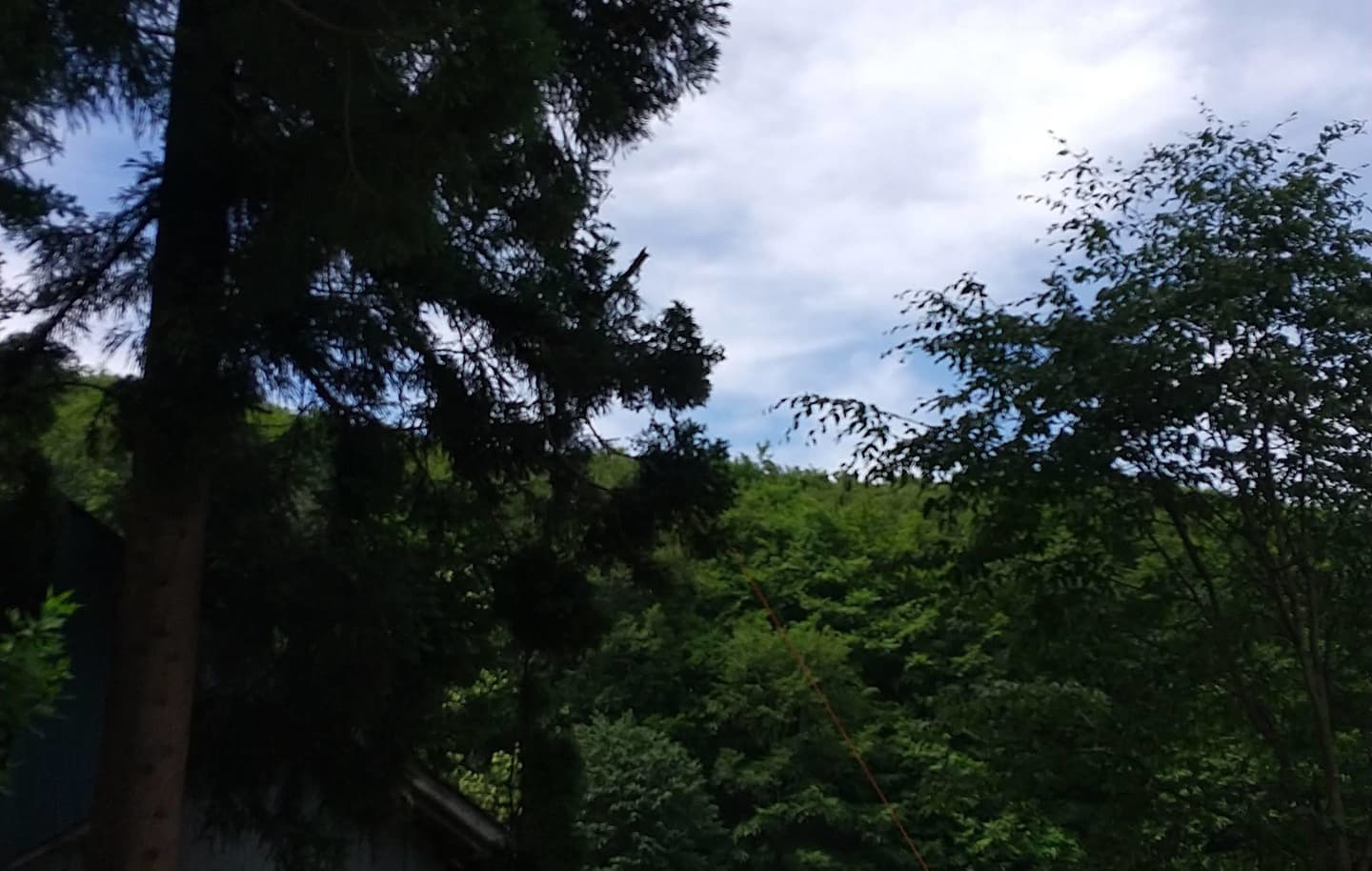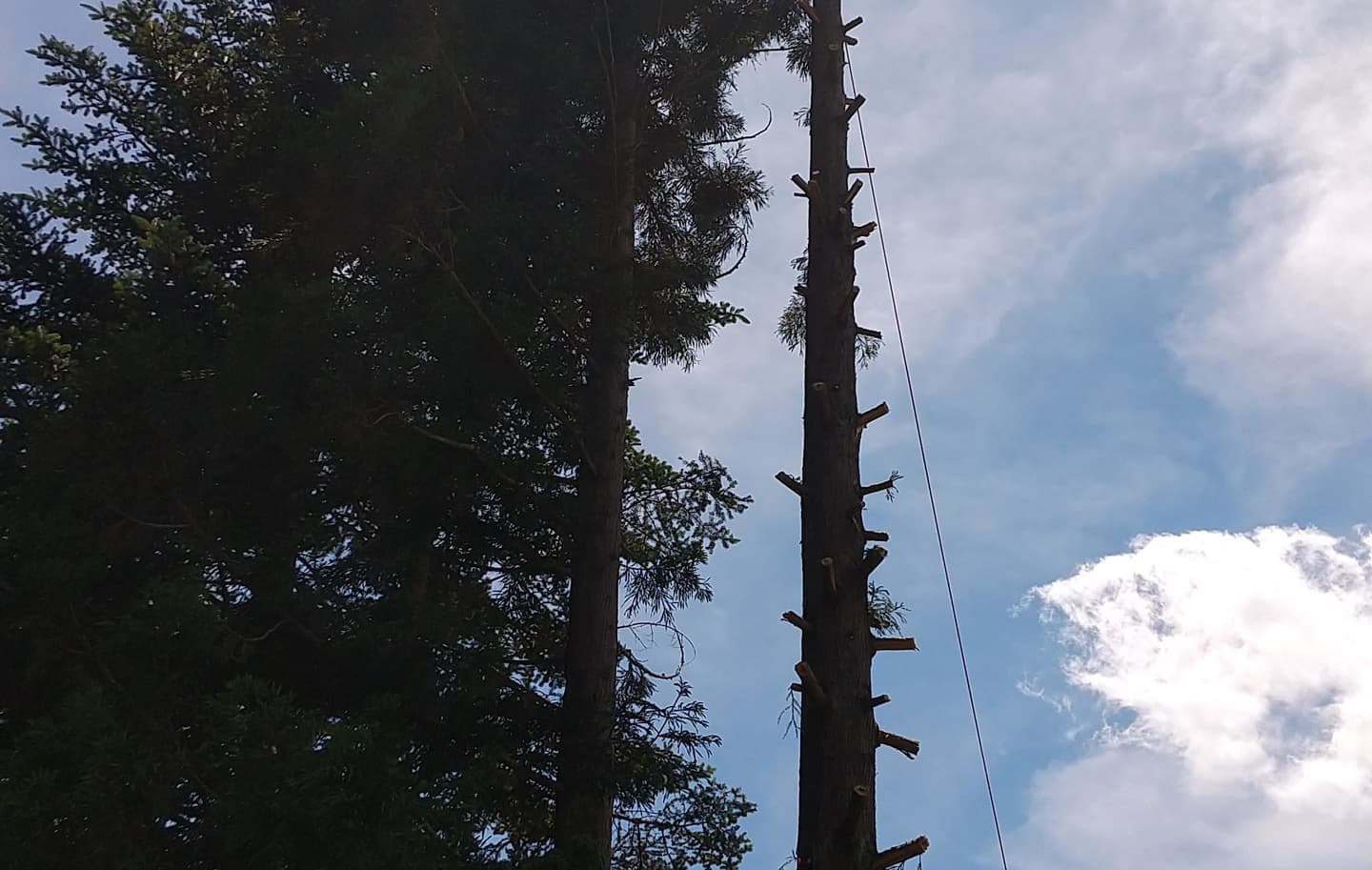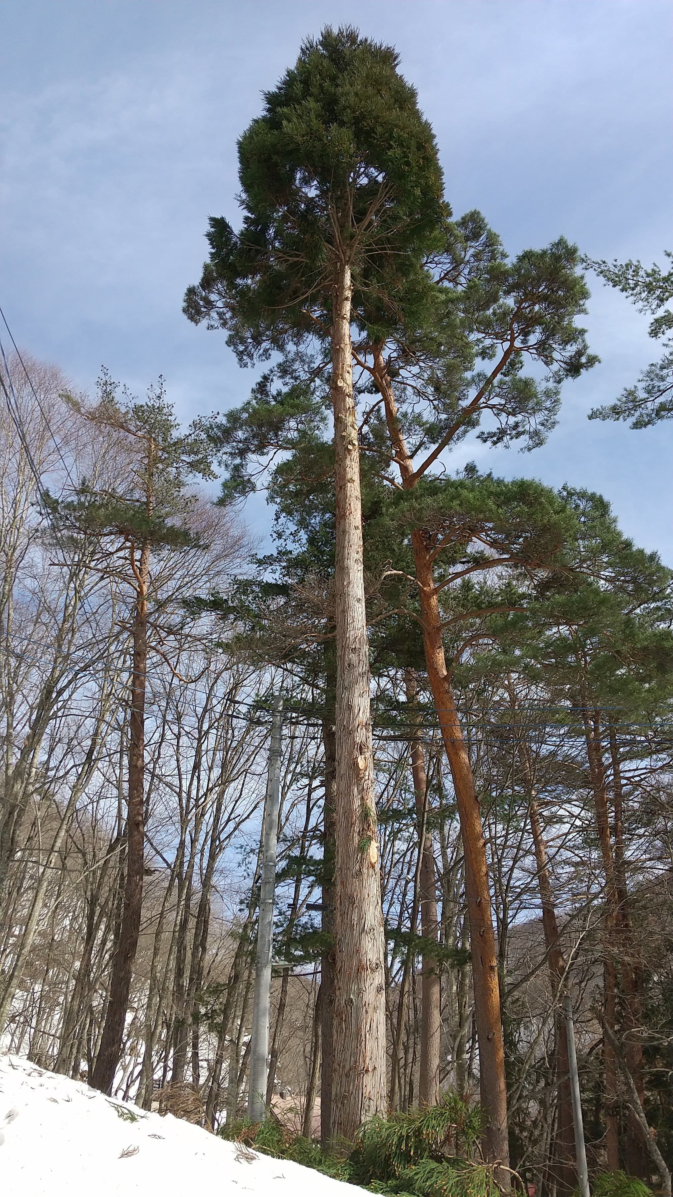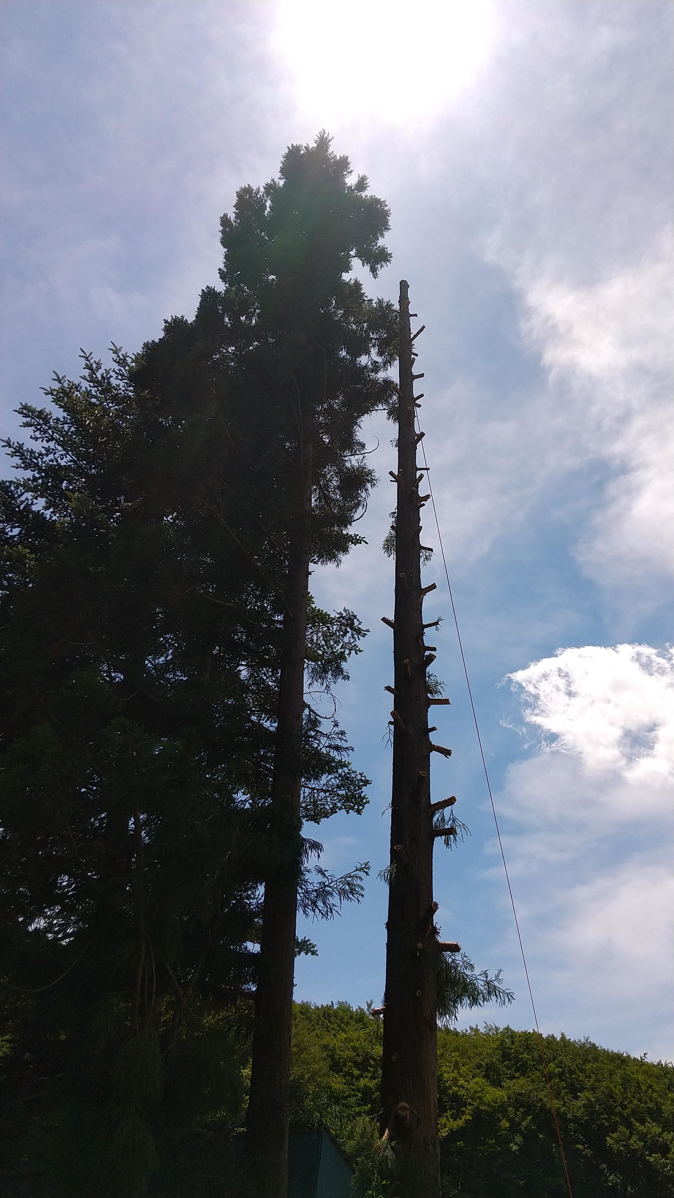 下の土地との境目擁壁上に生えている杉。まだ2m位の時に二本生えていたが、家に近かった一本はきりたおした。残した一本が15mを超えるほどになってしまった。擁壁のコンクリートも根によって割れてきた。これ以上放置できないということで、とりあえず上の方で生い茂っている枝を、特殊伐採の練習はじめで伐ってみた。今思えば、このときにトップカットまでしておけば良かったのだが、始めたばかりで道具も技もなかったので残念。