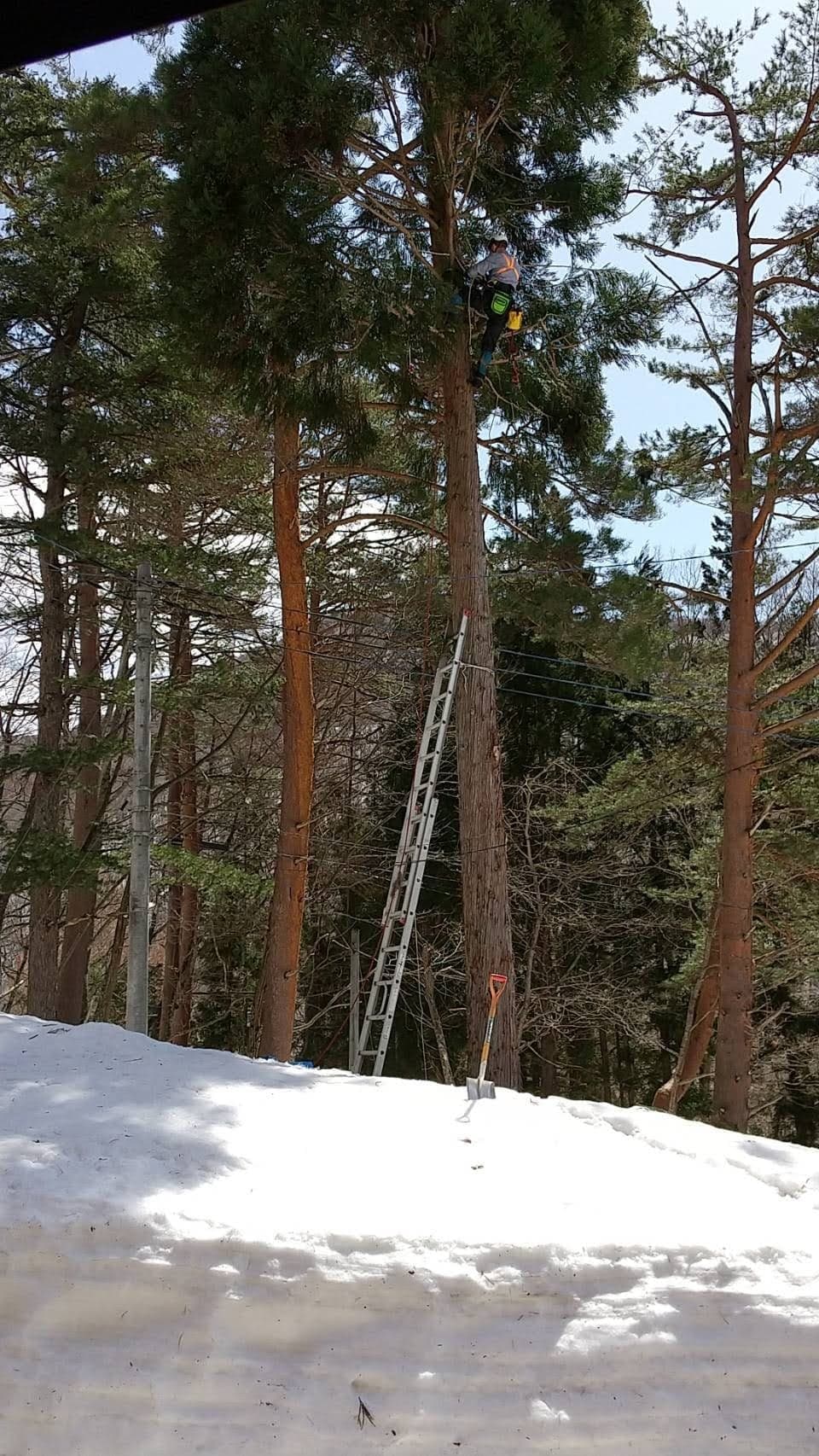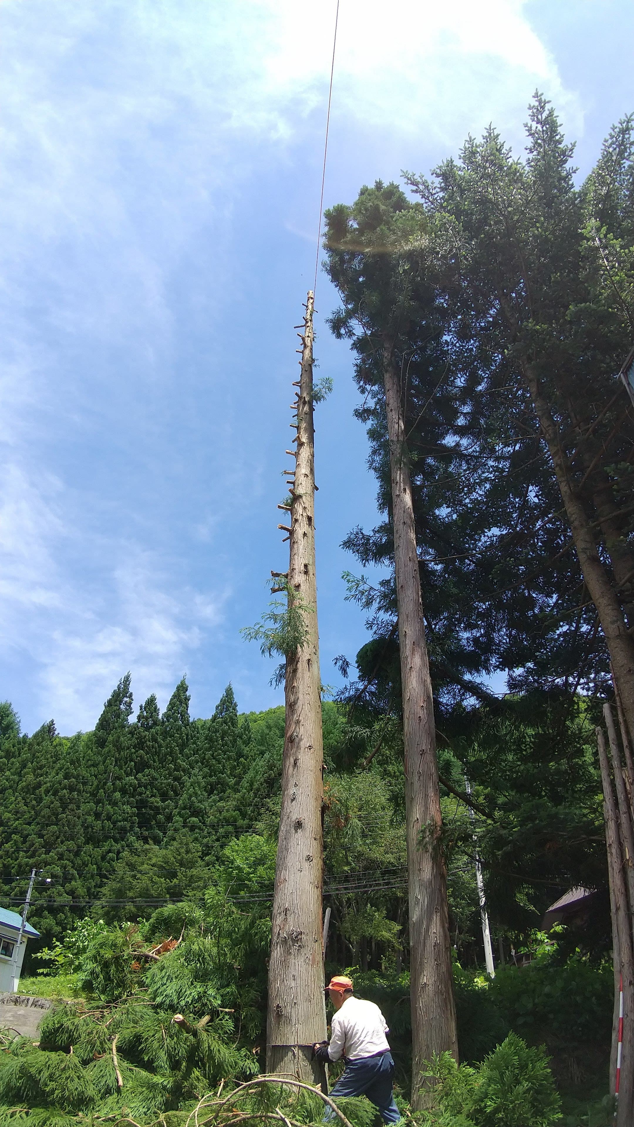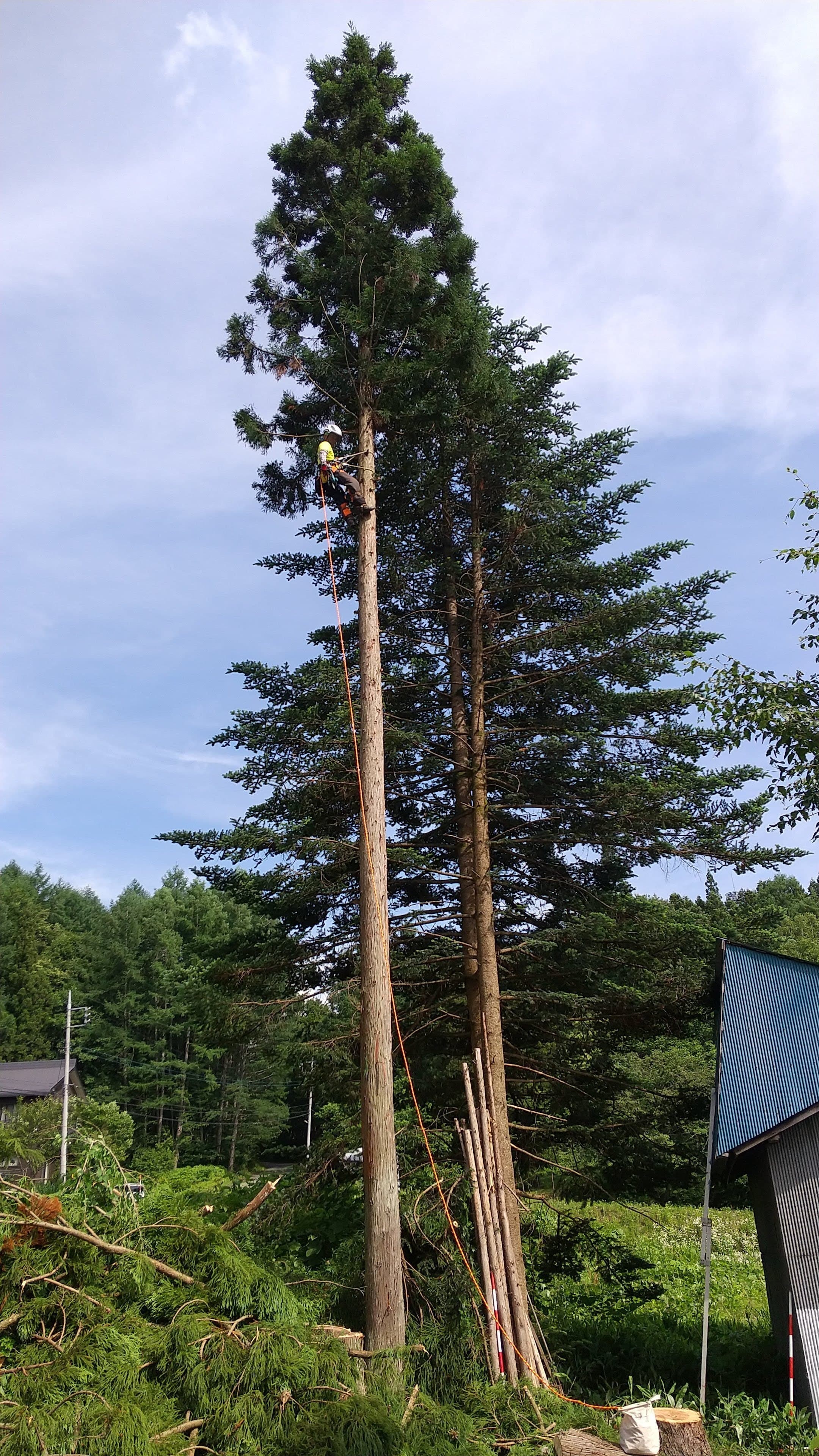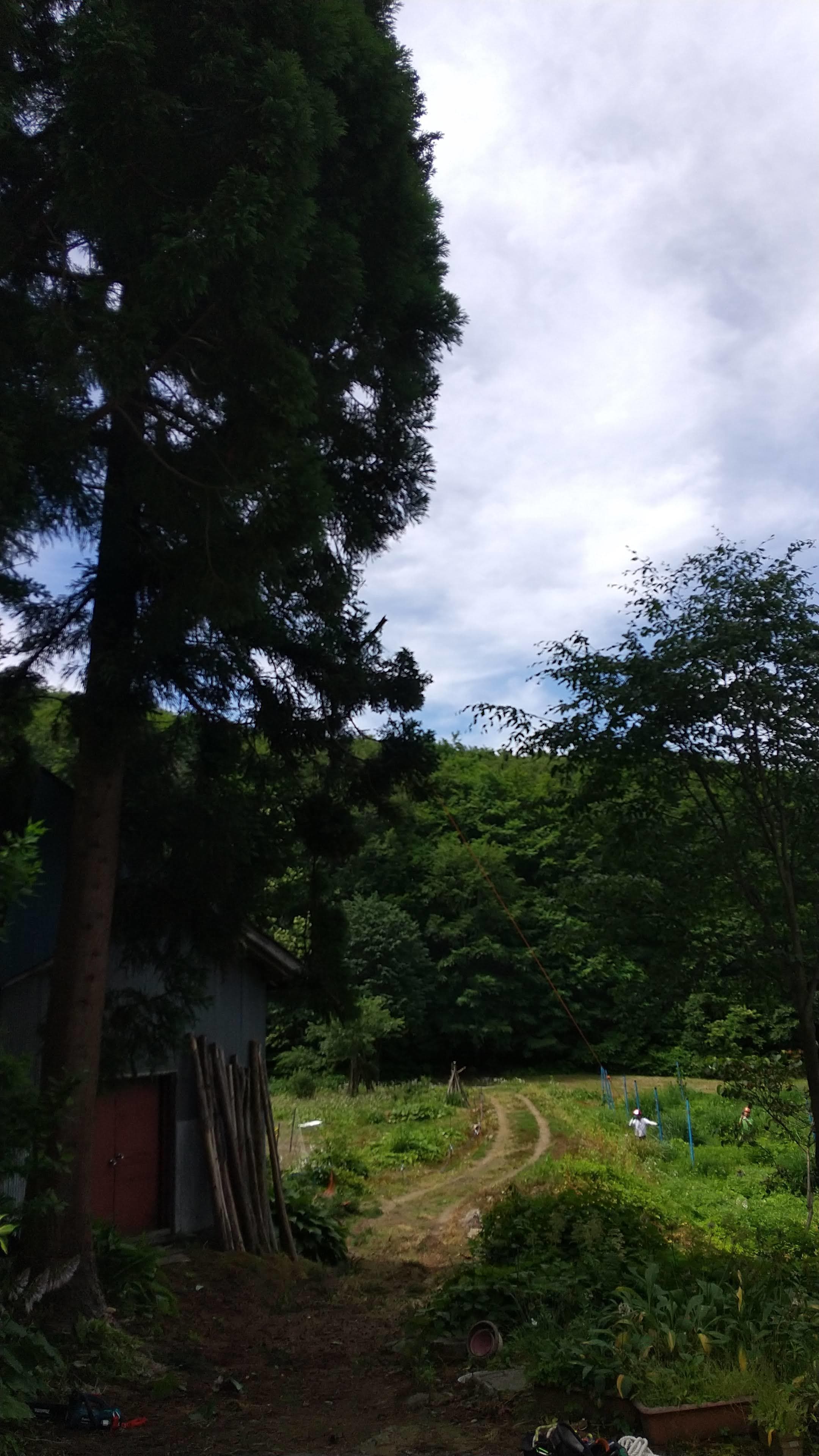 藤原の知り合いの家の、建物に隣接して立っている杉の木の伐倒。一本目は枝を払ってトップカットまでやったが、疲れたので二本目は若い衆に任せた。